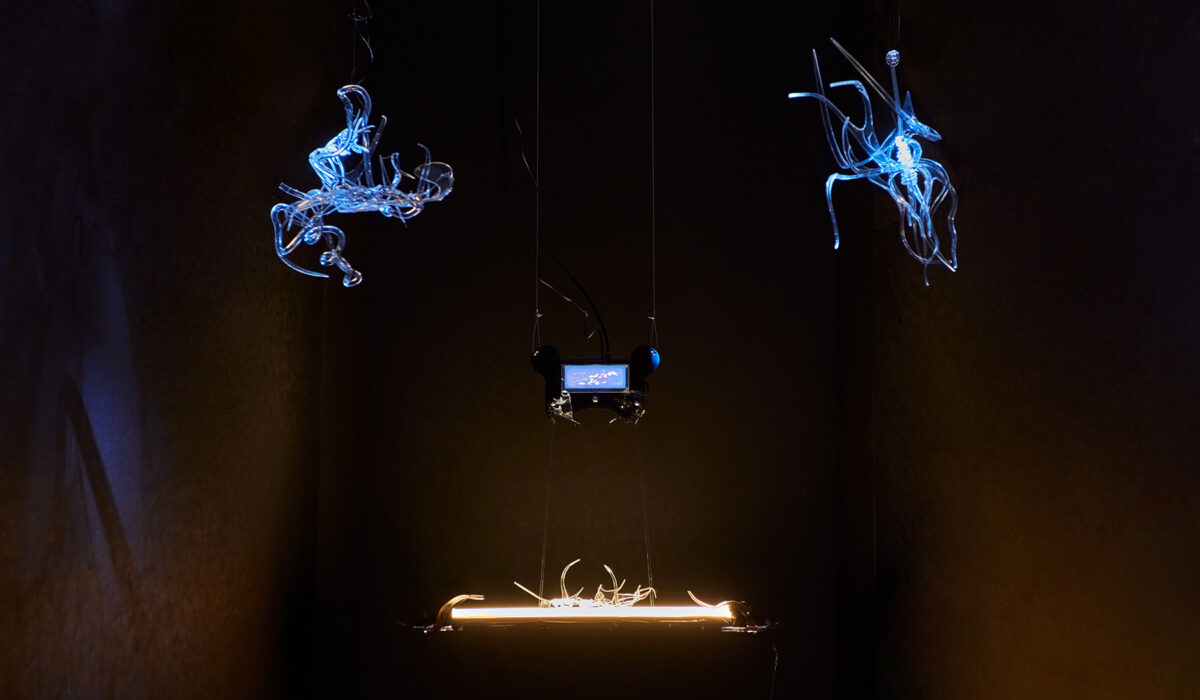 Positioned in the middle of the space, the work Excavation of Liquid Crystals depicts a fictitious story about how humans extracted artificial light from the glow-worm, an insect with light-emitting organs. This monolith-like site is only approachable through a set of artworks activated by different sources of light. Those act as characters inhabiting this environment. Behind that, in the back of the room, another work titled Maps of The Untamed Threshold, presents the “final” form of light as it becomes a digital screen playing an animation that recites stories about its creation.