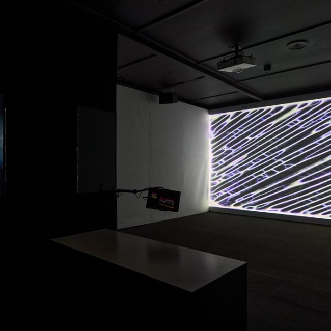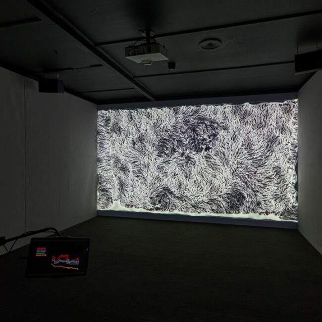The interactive installation places viewers in an immersive audiovisual environment where they can influence the imagery of the artwork in real time through their own brainwaves. By donning the brain-computer interface, the EEG sensor, participants witness the brain activity of their nervous systems being transformed into fascinating amorphous visual signals projected onto the wall, evoking both environmental and neurological patterns.