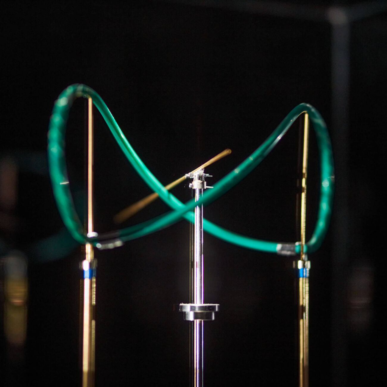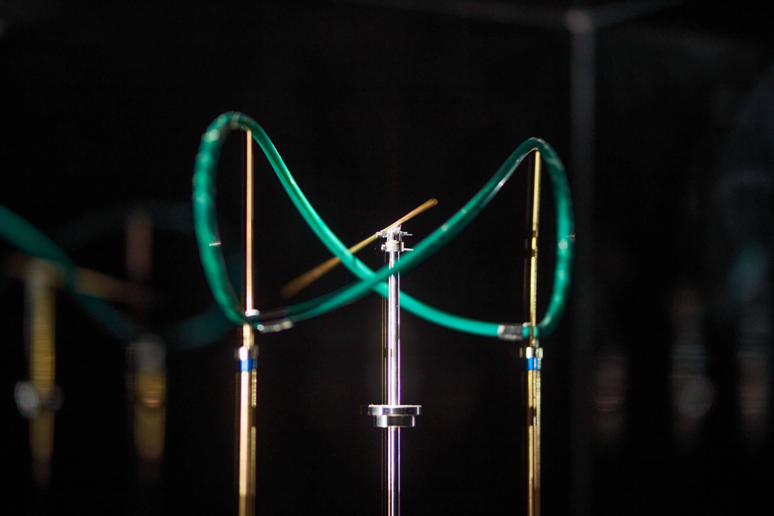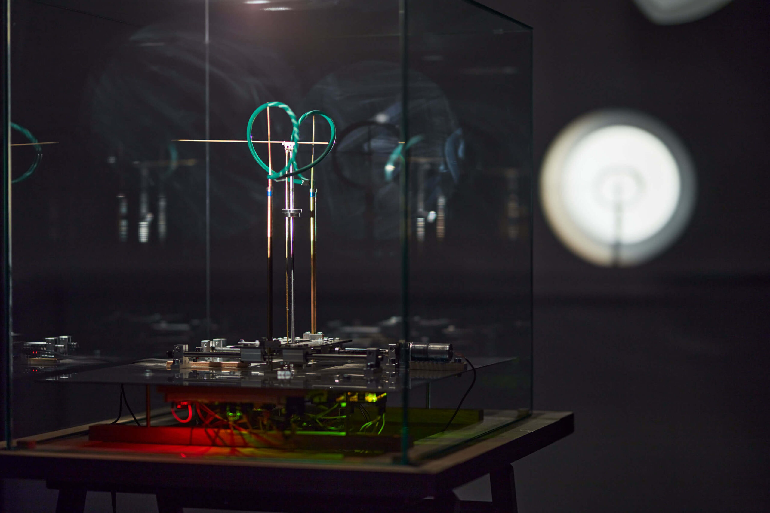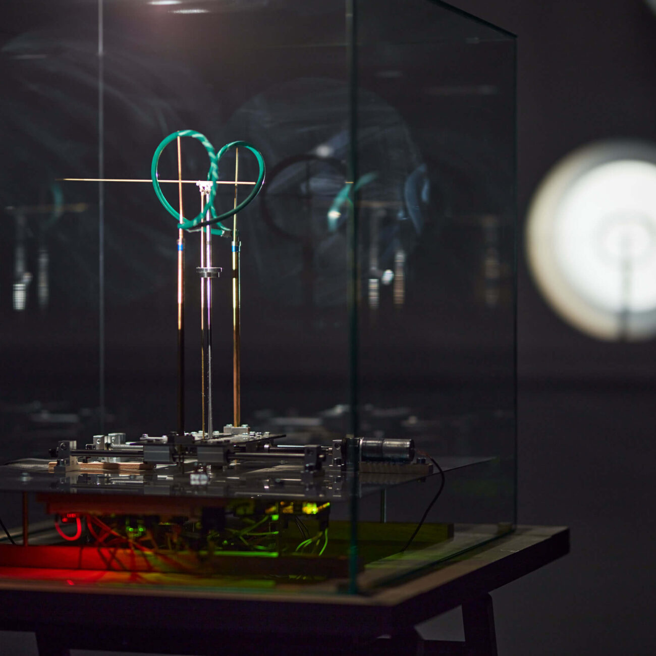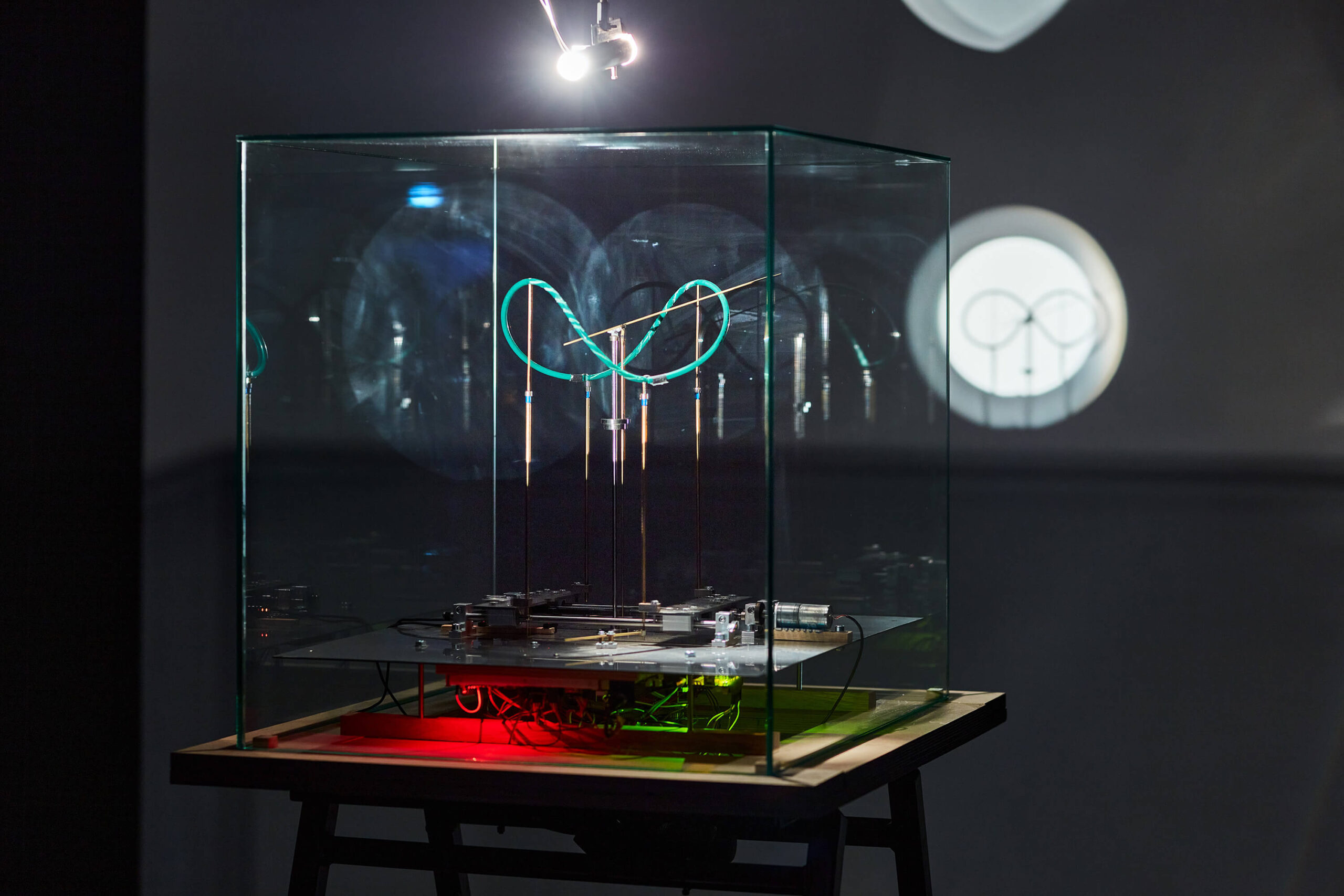 In the shadow image of a mechanical device ticking away under a glass box on a wall, reminiscent of the atmosphere of 19th century physics laboratories, we see a metaphorical representation of two conceptions of time and the continuous interweaving of the two conceptual approaches. The cyclical view of time, represented in everyday life by the rotation of the clock and experienced through the recurrent change of days and seasons, is morphed into the other conception, marked by the visual metaphor of the laid form of the number eight, called the lemniscate. This is a visual code of the continuous and irreversible flow of time, representing the never-ending equation of time. Playfully and sensually evoking the inseparable interdependence of the two perceptions, the delicate image of the light/shadow plane projected onto the mechanical structure repeats the spatial choreography of the mechanical structure, elaborated with mathematical precision, in an infinite sequence. The kinetic installation can be interpreted as a ‘time machine’, a three-dimensional light drawing, a moving image or simply a poetic scientific experiment.