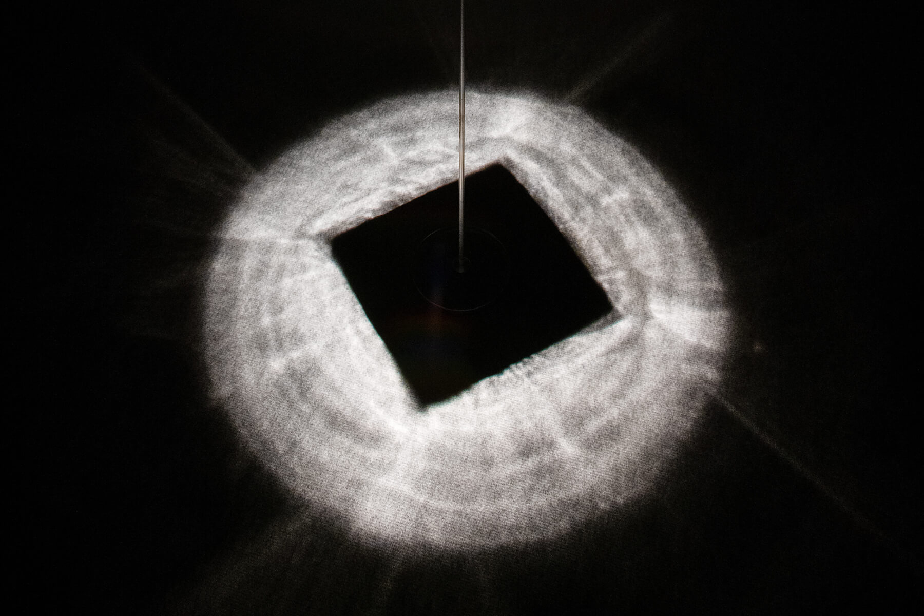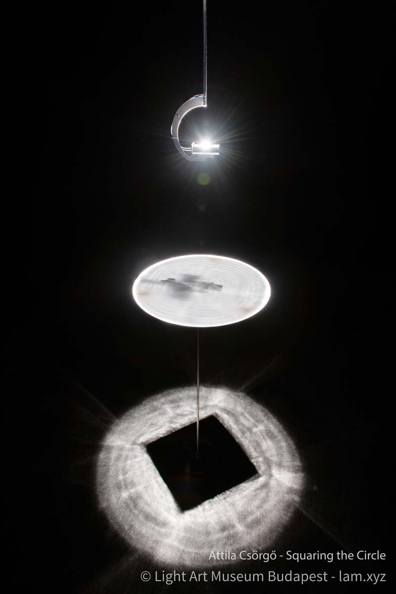 Csörgő’s work does not take any position of the “squaring the circle” from a mathematical point of view, but he sees it as a philosophical approach to the problem identified with the logical dead-end of classical geometry. He gives an objectified metaphor for an idea that is impossible to realize. The soul of the light sculpture is a mirrored surface curved in space, which transmits the light of the lamp above it in such a way that the rays first gather in a circle, and then, when they penetrate further to reach the floor, the shadow cast by the circle is transformed into a square.