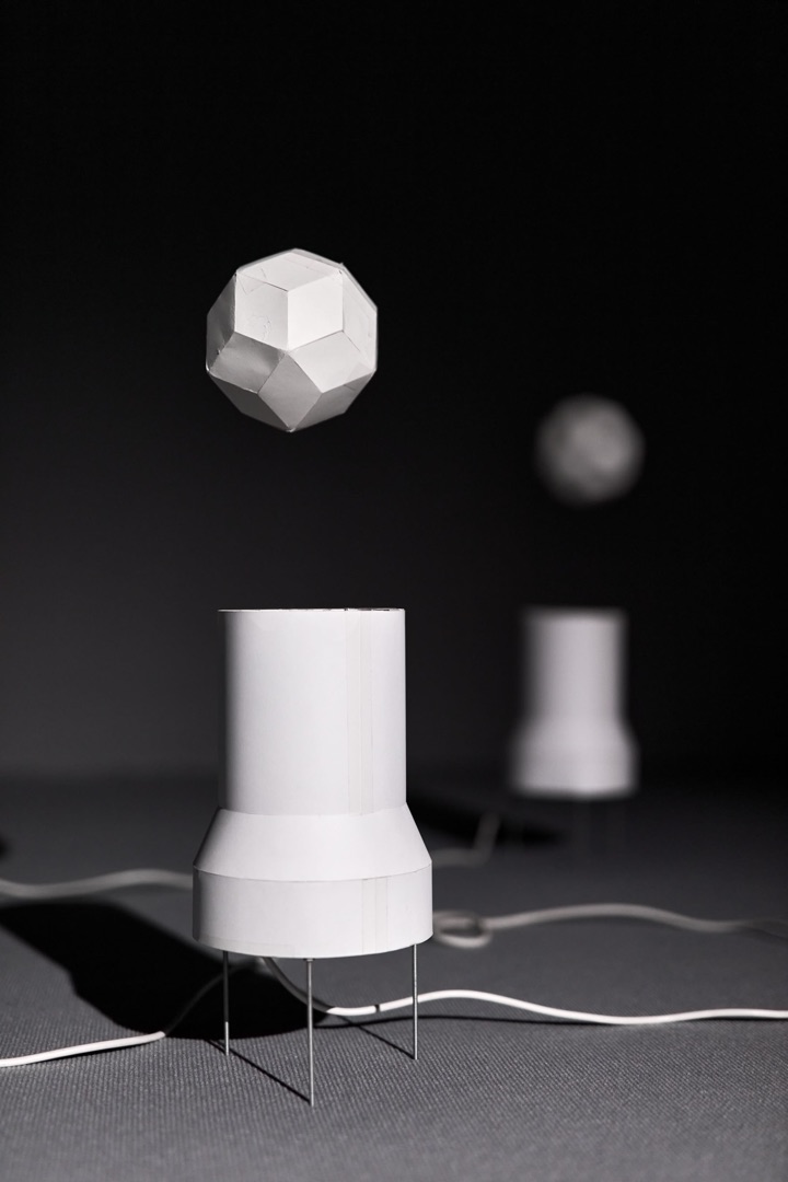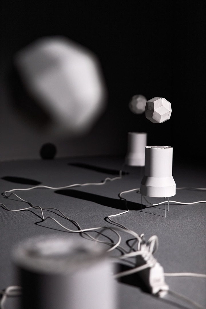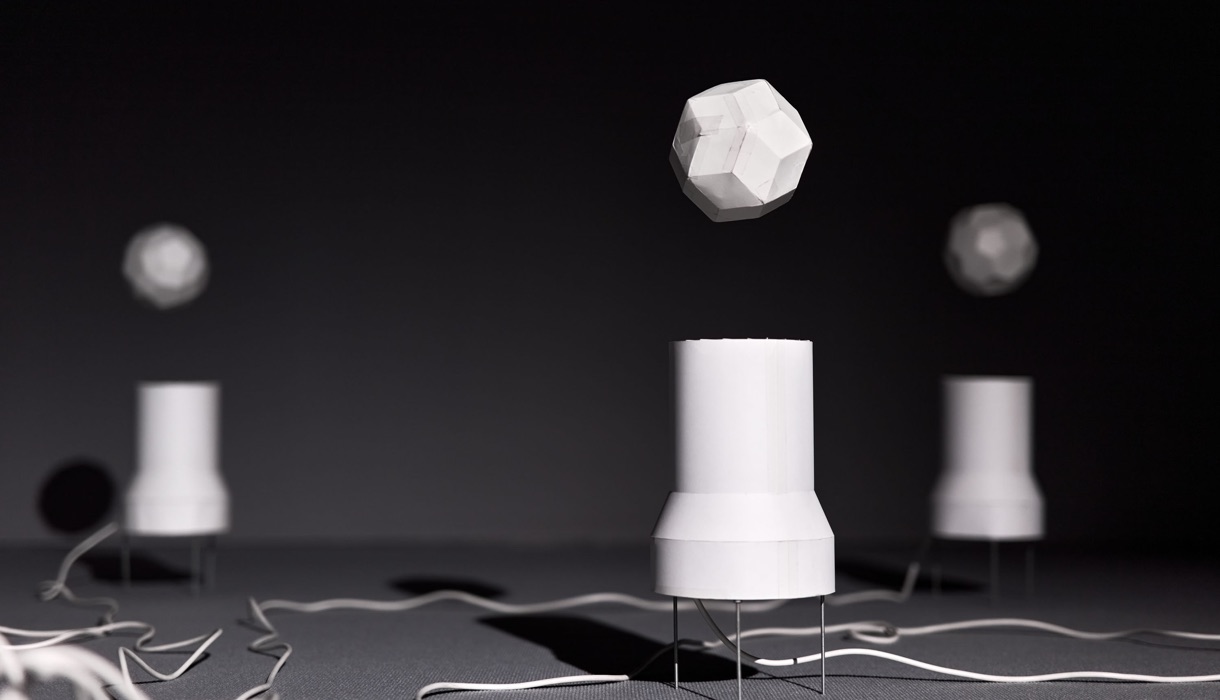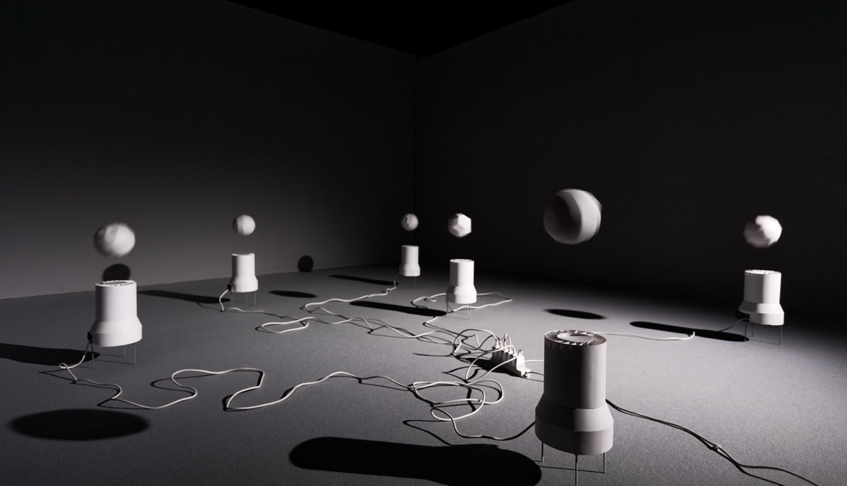 The dance of paper balls floating in rising air waves is closely related to the structure and shape of their surface, according to the laws of aerodynamics. As these geometric solids are only approximations of a regular sphere, their slight deviations from a perfect spherical shape create unique interactions with air currents. The specific patterns of the flat shapes that the artist uses to construct each approximation of a sphere and create different surface textures and microgeometries, which in turn affect how air flows around them and collides with their surfaces. These subtle differences in airflow interactions cause each quasi-spherical solid to rotate, bounce and float in its own unique way, transforming the matrix of fan cylinders into a stage for a varied choreography of movement. The relationship between the structure of the spherical bodies and their aerial dance can also be understood as a visualisation of complex physical principles, where the imperfections of the spherical structures become the very characteristics that give each spherical form its unique character in levitation.