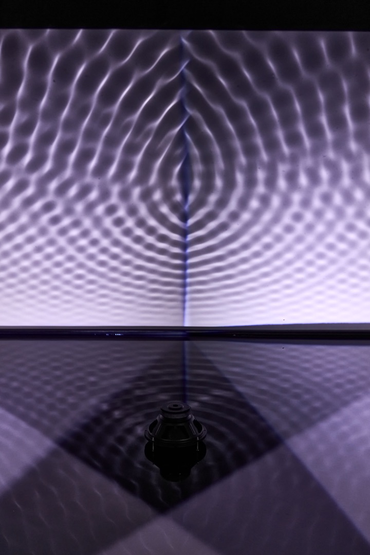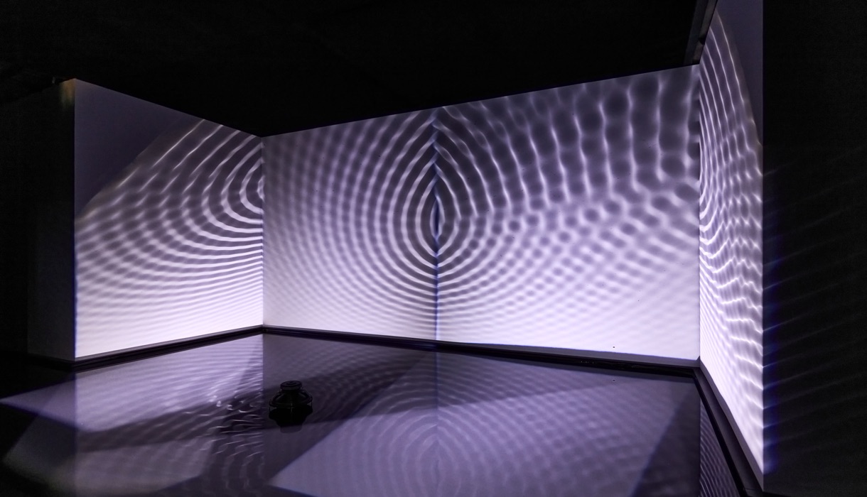 In his installation, Icelandic artist Finnbogi Pétursson creates a meditative space with a special atmosphere. In a shallow pool occupying most of the space, there are three speakers that repeatedly emit 3-hertz sounds. Vibrated by the sound waves, the water surface begins to ripple in concentric circles. The shadow of the lights illuminating the water surface is cast onto the wall and the fluid swirl of the intersecting waves fills the space.