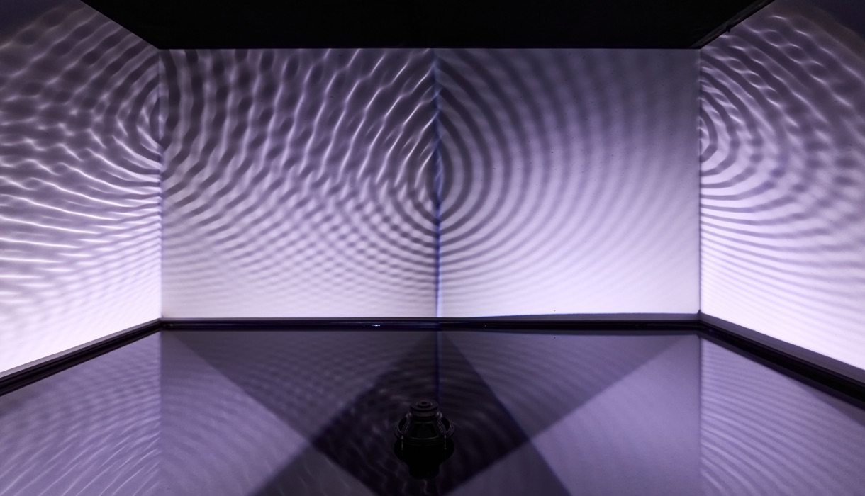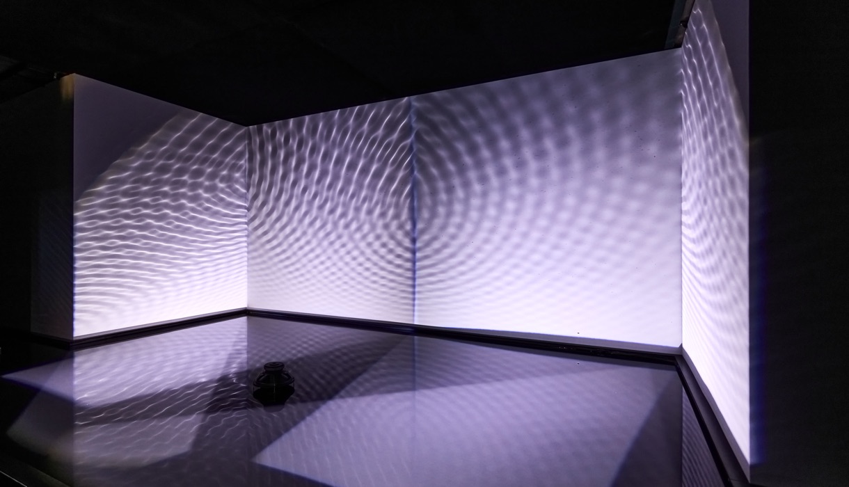 3-hertz sound waves are inaudible to the human ear, but their pulsation can still be felt in the space around us. Infra-Supra (a reference to the alternating negative (infra) and positive (supra) directions of the sine wave relative to zero) creates a space allowing the visitors to immerse themselves in the gentle swirl of ripples on the water surface and sound waves that can induce a meditative trance state.