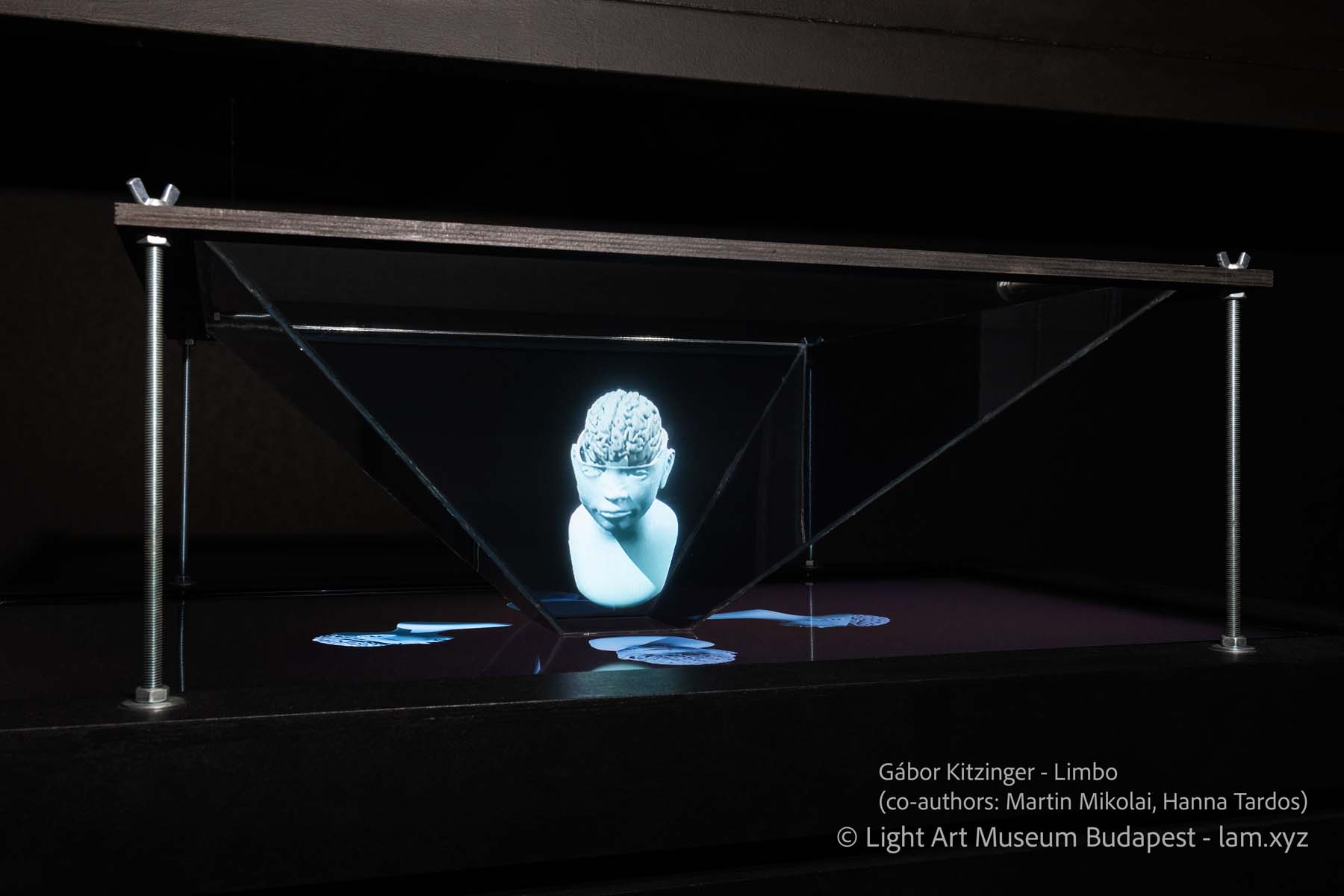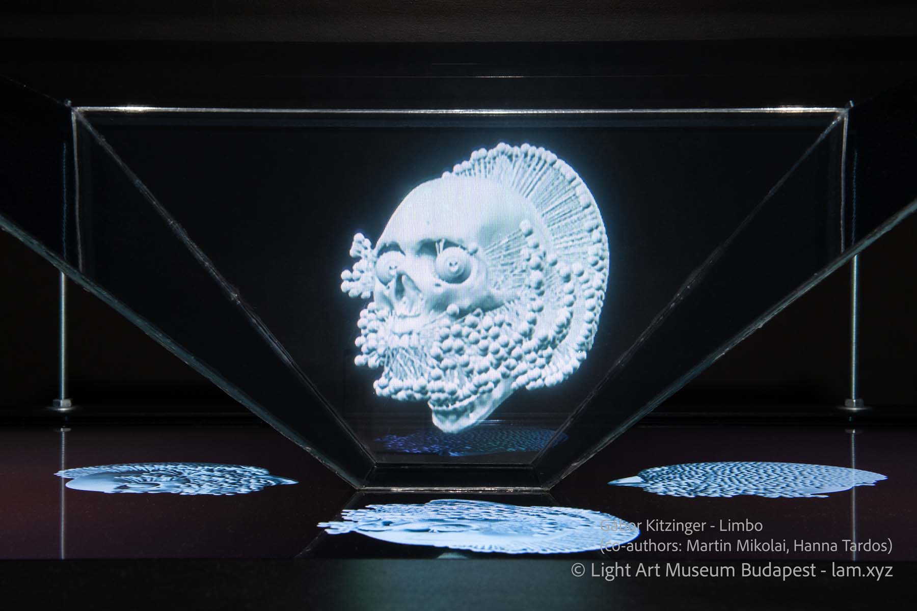 This interactive sculptural object explores the relationship between nature and technology, machine and organism, order and freedom. Limbo uses recursivity and contingency as two basic philosophical concepts of human existence. The installation reveals the constantly recurring life cycle of a digitally generated entity. In the virtual space of the program, four cameras record the simulation, which is ultimately displayed as a three-dimensional holographic image in a Plexiglas pyramid, or frustum. The holographic animation depicts a bust, which is the actual prototype of the life path of the entity presented, from the zygote state to death. The last state refers to purgatory, the theologically possible “limbo” on the edge of hell, which ensures that the entity is forced into a never-ending, repetitive cycle. The iconoclastic noise composition that accompanies the installation interacts with the gestures of the viewer encountering the work, breaking and somewhat modifying the monotony of cyclical permanence.