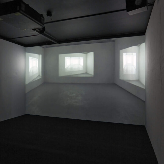 In the initial scene of the film white light is projected onto three walls of a room by three projectors. The number of projectors refers to the spatial dimension bounded by planes as well as to the visual and spatial relationships accumulated by the recordings. Since each of the walls shown in the film serves as a projection surface, we can shift our gaze from one projection surface to the other, allowing us to have a more complex perception about the connection between space and image.