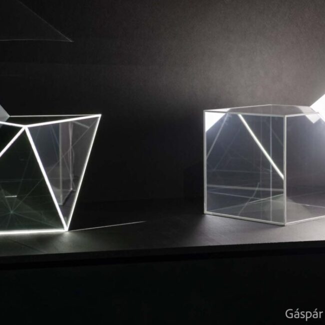 The light installation Two Forms by Gáspár Battha is based on a peculiar dialogue between two solid bodies from Plato, the cube and the octahedron. Both essential shapes are composed of equal polygons and are placed side by side in such a way as to test the viewer’s perception by using the illusion of vision based on the laws of geometry. The solid cube stretched on an octahedron of glass plates and the octahedron stretched on one corner of a geometric body of transparent squares are seen as a mirror image of the two shapes, created by rescaling them in size according to pre-programmed lighting sequences. The light that runs along the edges of the basic geometric forms, outlining and then obscuring the elements that make up the installation, makes sense in a system coded in time. The illusory experience of spatial masses in Battha’s work is coupled with a curious dimensional leap, resulting from the vertigo effect of the continuous recursion of geometric forms reflected on the light-absorbing glass surfaces and, in contrast, the point-like and linear extension of the light rays that trace the edges of the bodies.