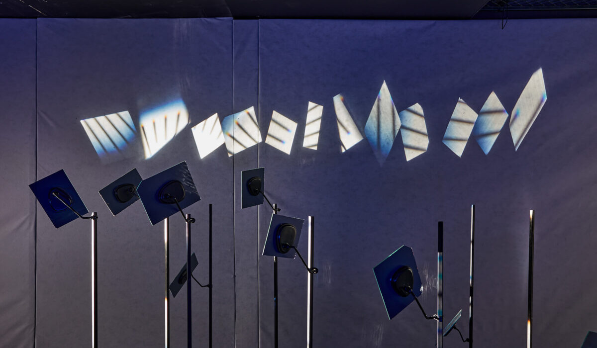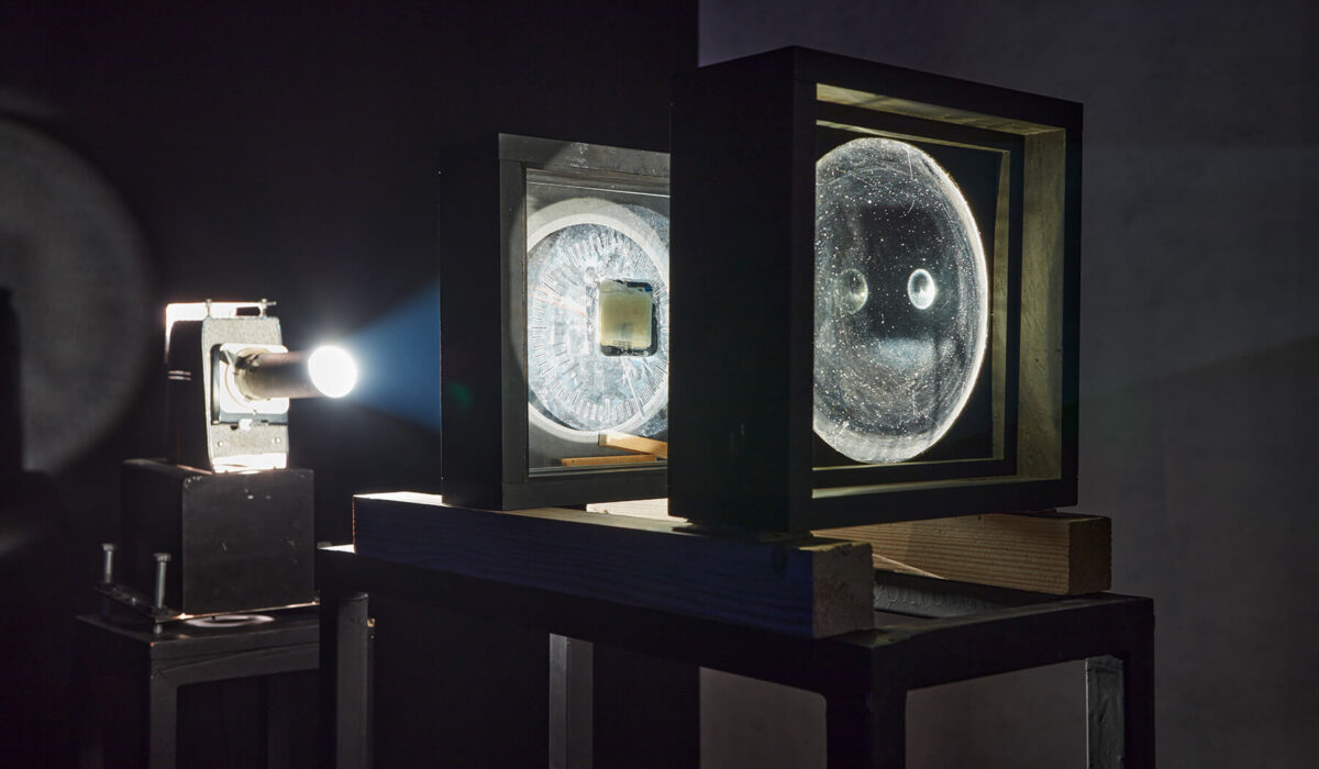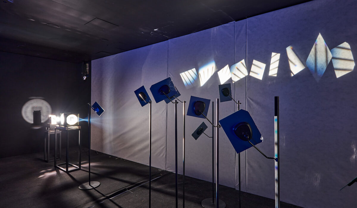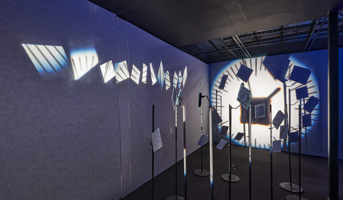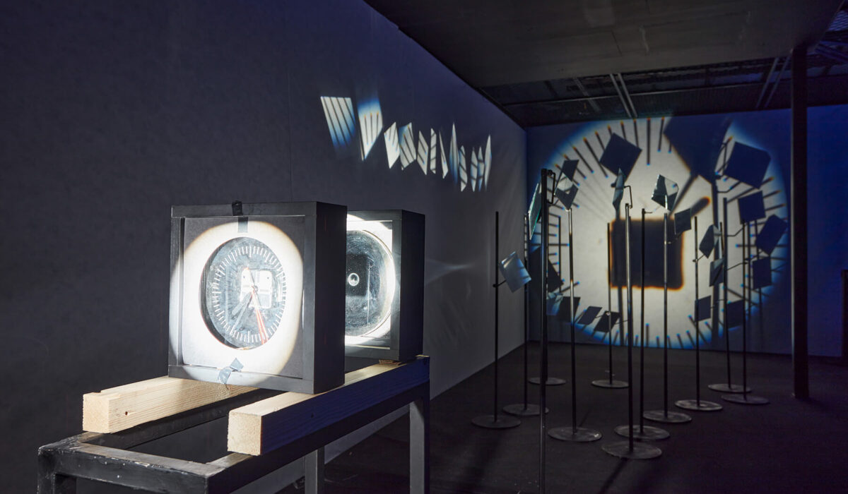 Light installation (slide projector, clock, condensing lens, mirrors, stands) 990 × 300 × 200 cm (Irokéz Collection)