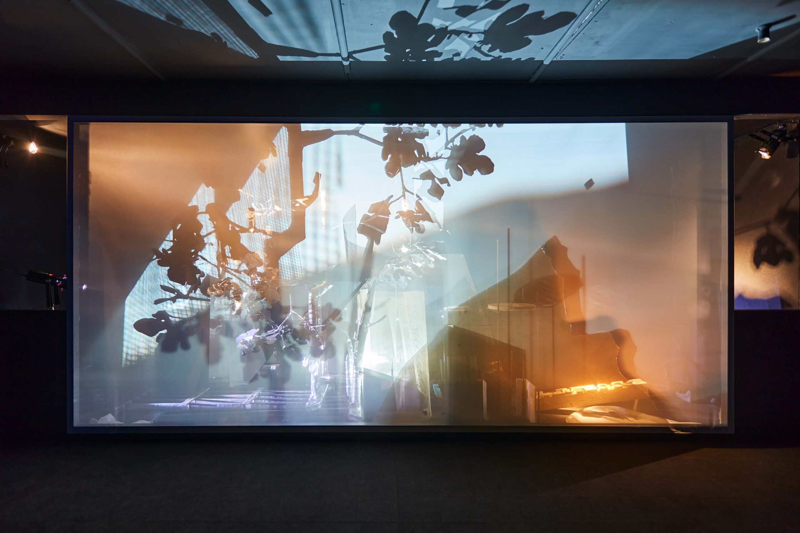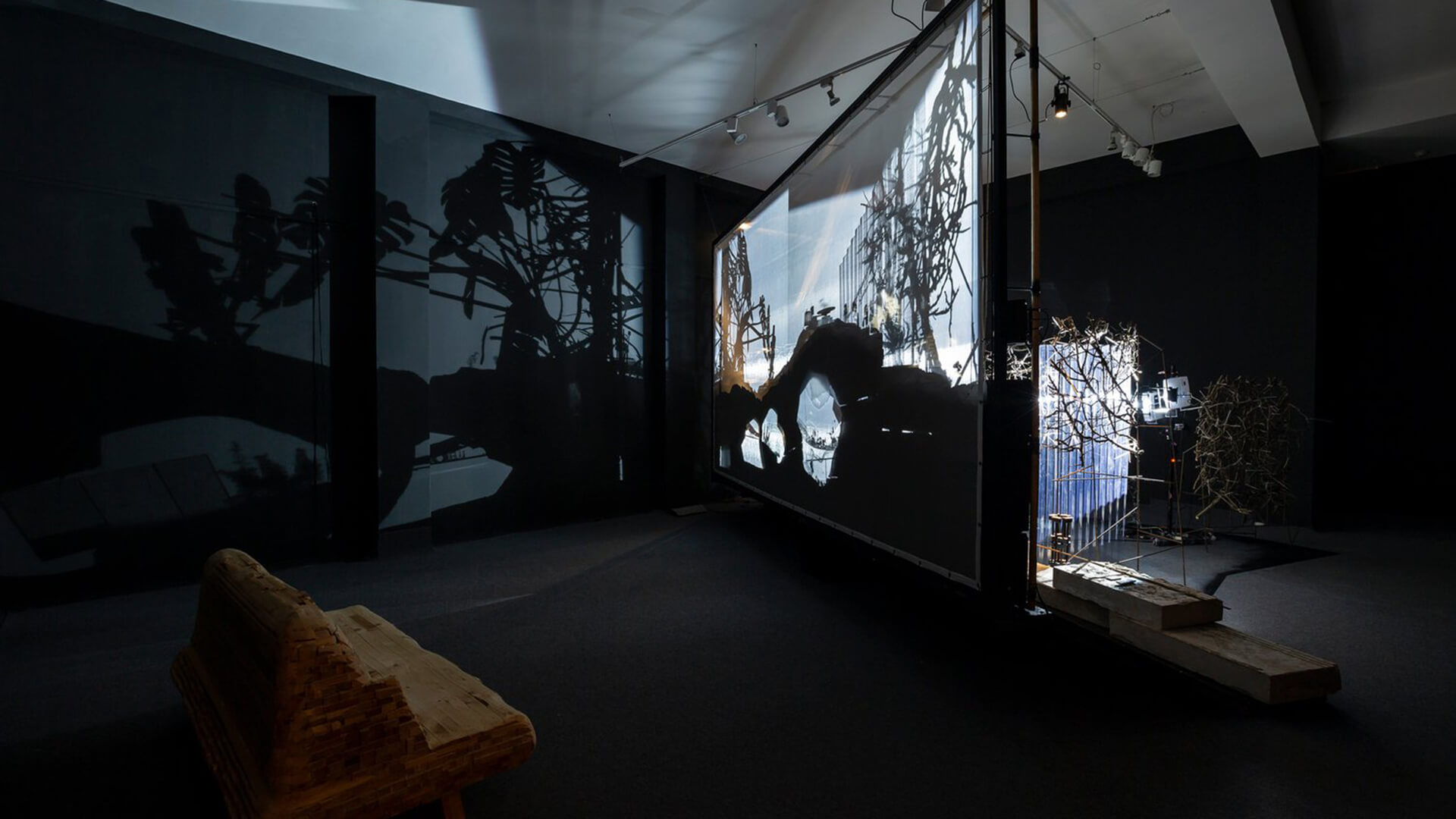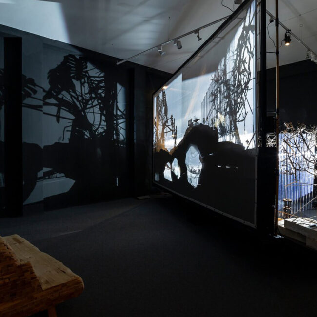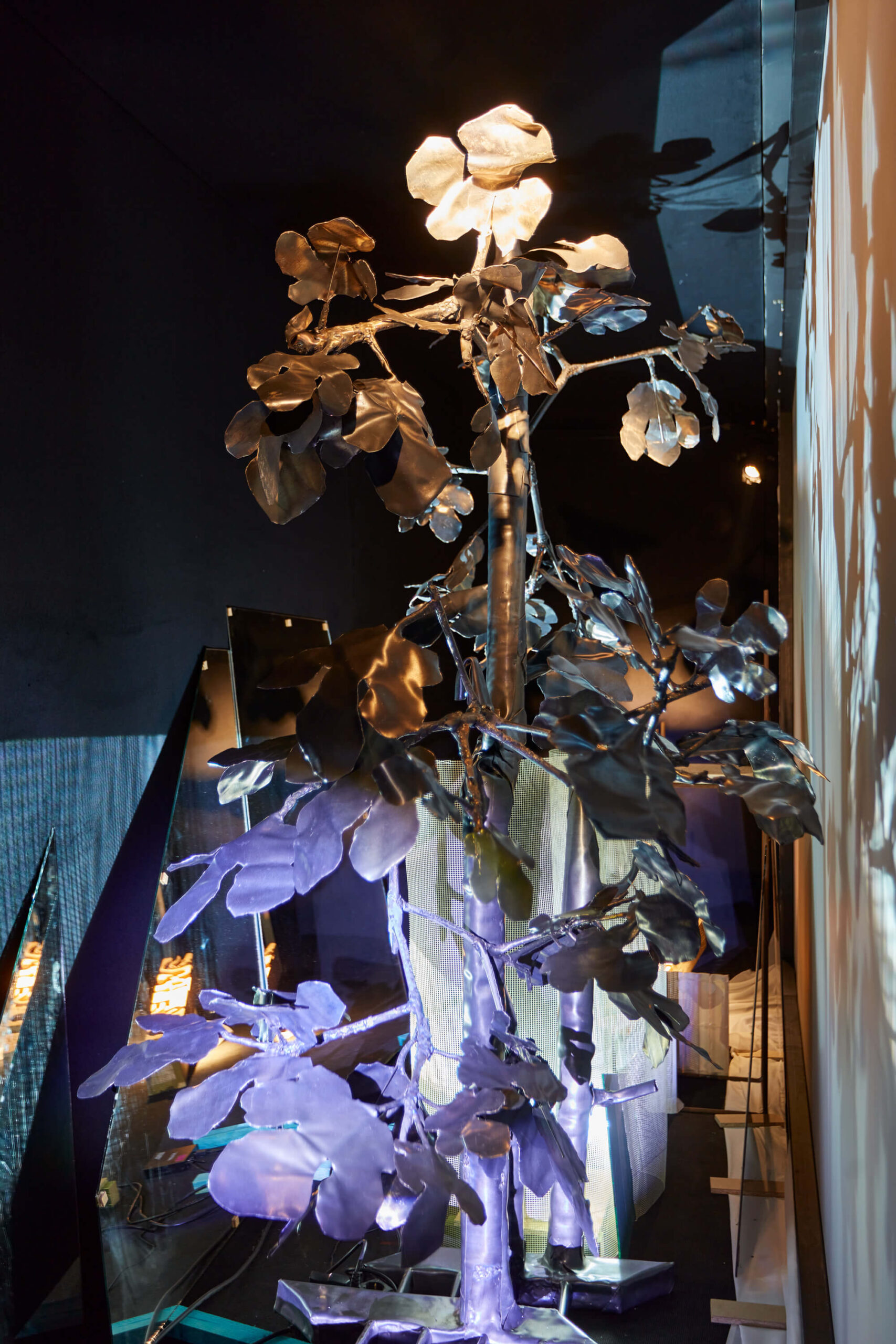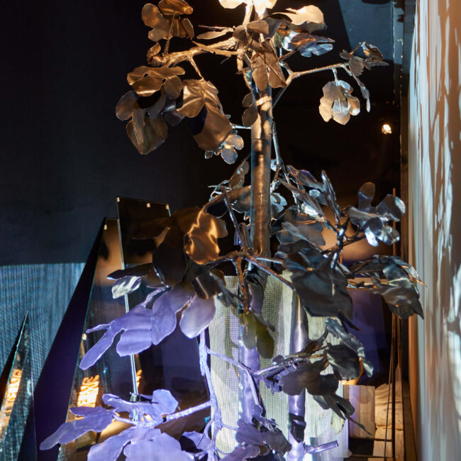 The shadows cast on the screen create a dystopian landscape made up of a chaotic array of objects, with the only light coming from the shimmering metallic leaves of the mythical fig tree of a lost Eden, mutated by radiation.