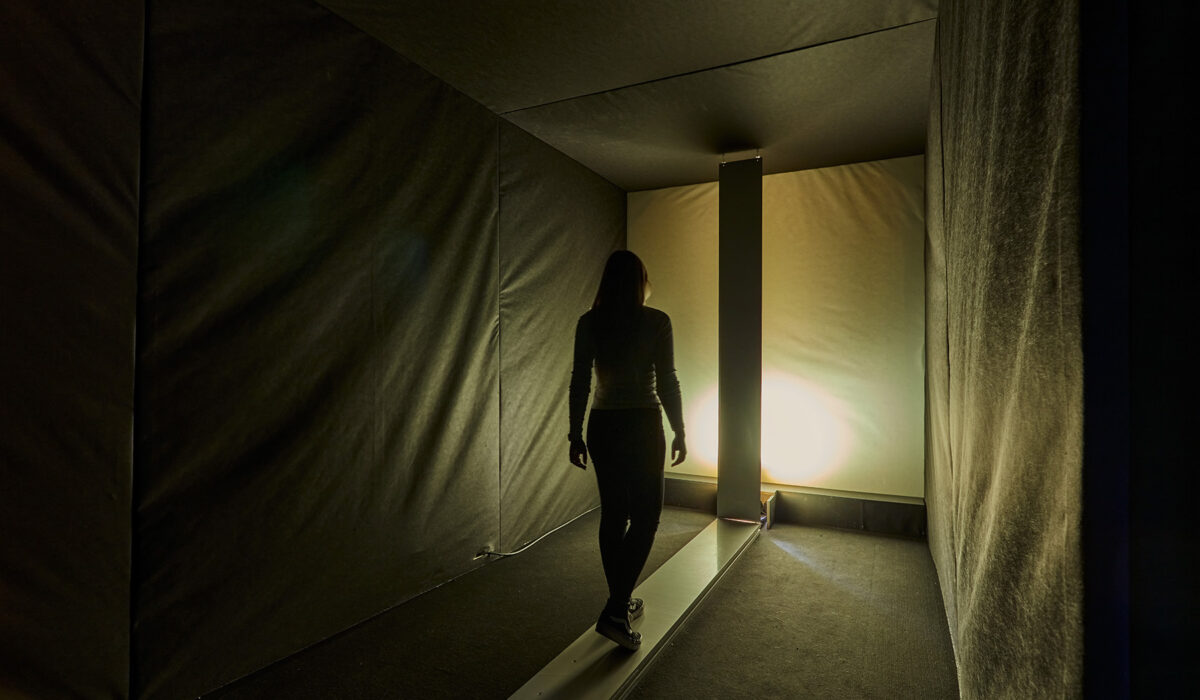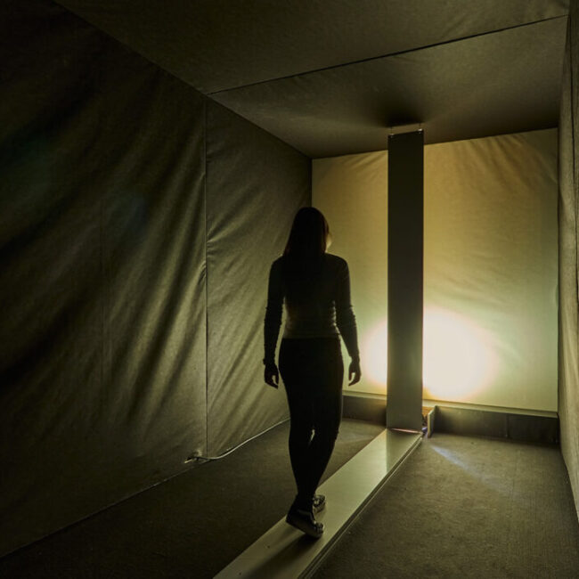 The meeting of the all-white surfaces and the projected light also removes the visitor from the world around them, to confront them with their own movements and actions in a hermetically sealed environment. Thus, the light focus becomes a hypothetical replica of the viewer and an observer of themselves.