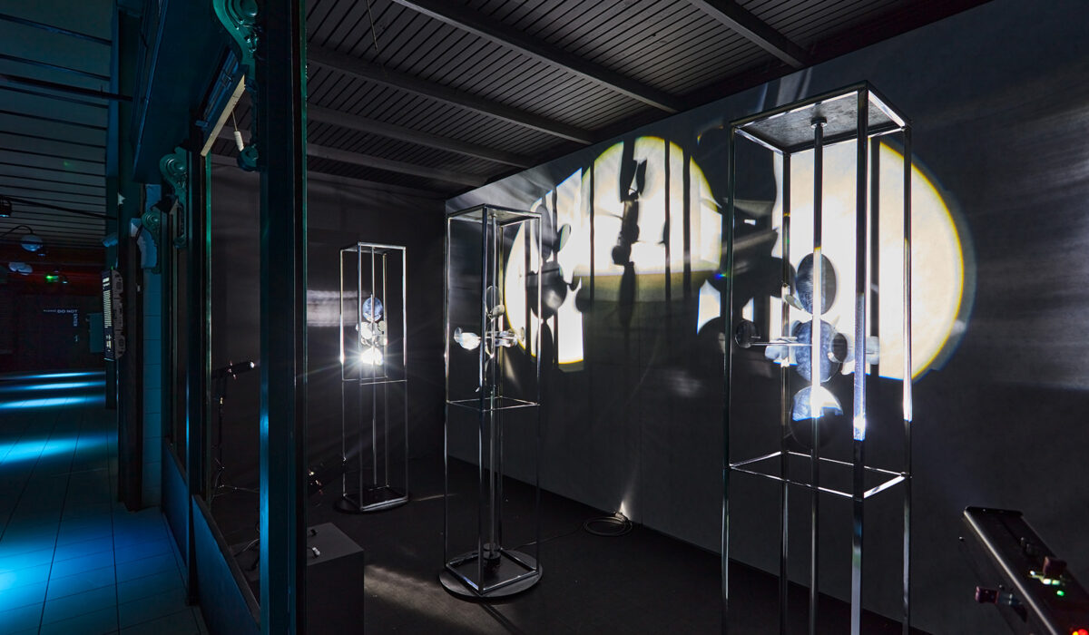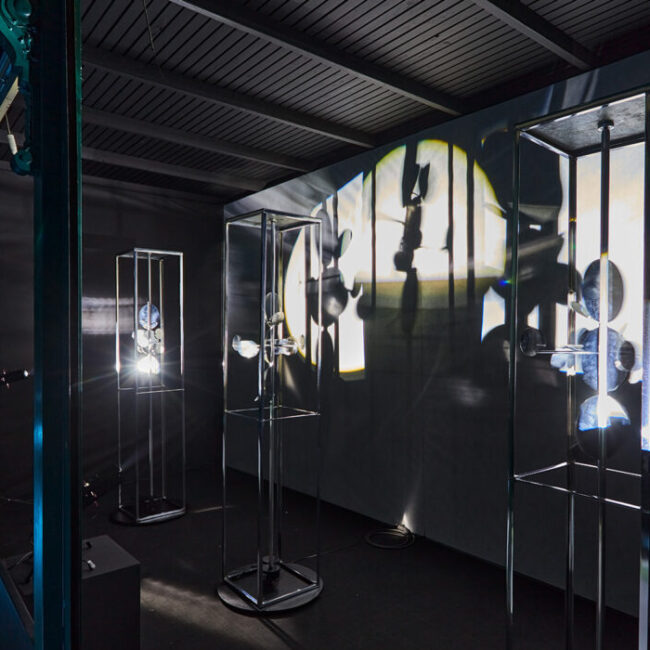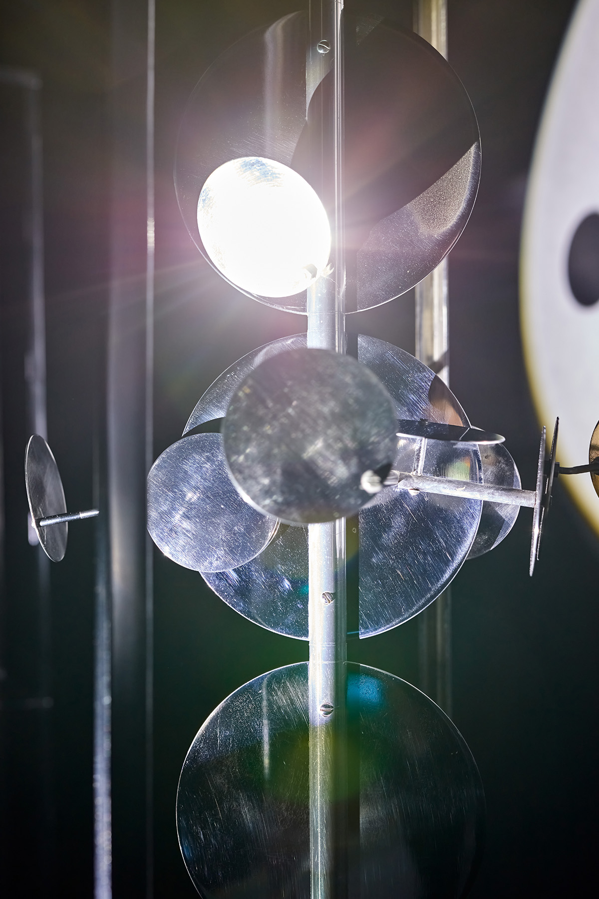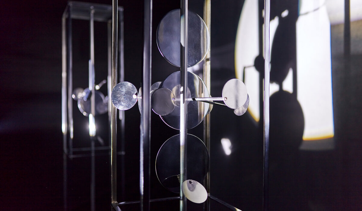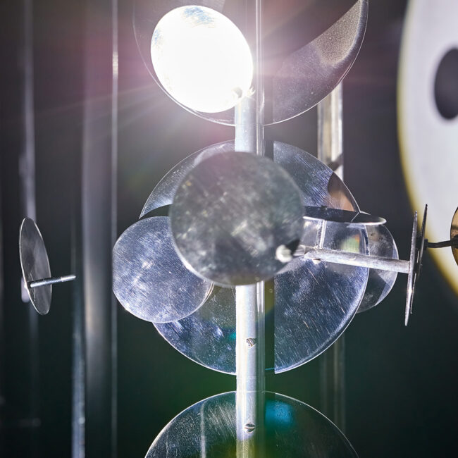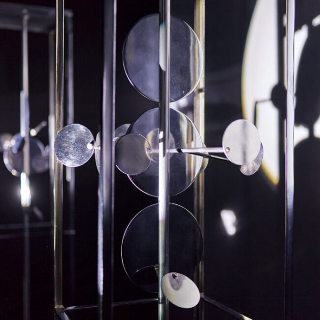 The Light Modulators I–III are Lajos Dargay’s masterpieces. Inside the three square-based cuboid prism nickel frames, there are three bigger consecutive nickel disks surrounded by smaller ones. As an interactive reaction to light, the plates are rotated by an electric motor. These slowly revolving illuminated disks start a luminokinetic display: they spin around one another following a special orbit, they reflect light flickering and shimmering and they project light on their environment. Due to real and virtual motion, the constructions are constantly changing, thus incorporating time as a constituent part of the artwork. The body of the sculpture ensemble is finally dissolved by light and motion, the structure itself is dematerialized and projected into space by the light it mirrors and reflects. This light environment is the actual work of art Lajos Dargay intended to create.