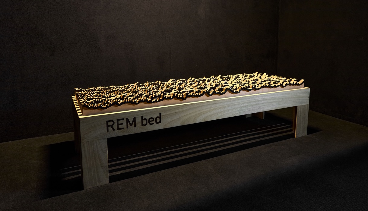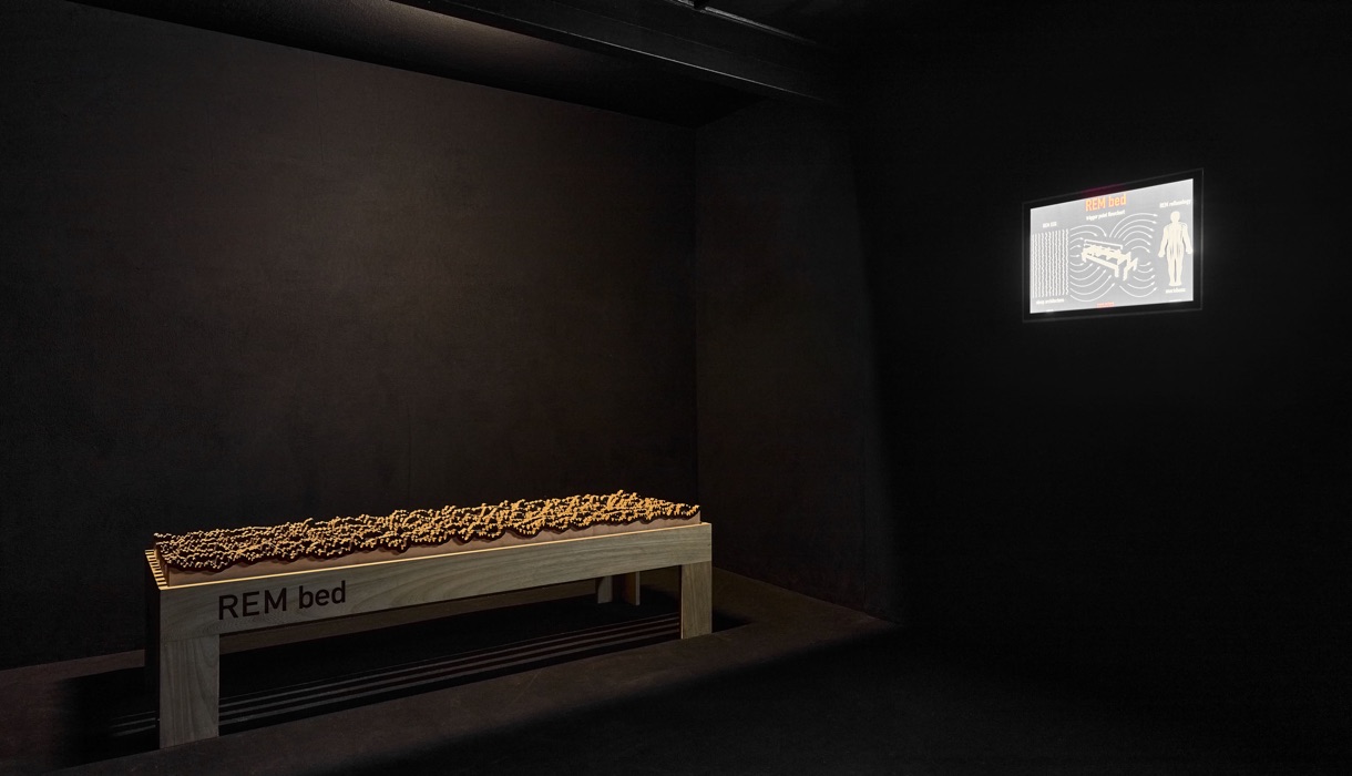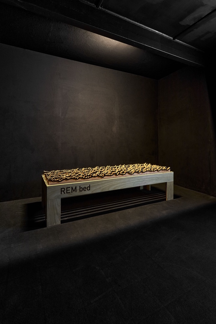 The REM bed, another prototype of the artist’s fictional brand INERS, developed over decades, is the objectification of a thought experiment that ironically combines the findings of neuroscience with the concepts of traditional Chinese medicine. It is a grotesque critique of the excesses of the wellness industry disguised as revolutionary sleep technology. The bed’s undulating wooden surface activates reflexology points by matching patterns of brain waves generated during REM sleep to twelve meridians that run through the body, transforming sleep patterns into physical sleep experiences. A challenging piece of extreme furniture, the REM bed exemplifies how late capitalism commodifies cultural traditions and basic human needs. It provides a somatic experience for understanding late modern urban people’s contradictory relationship to rationality and irrationality.