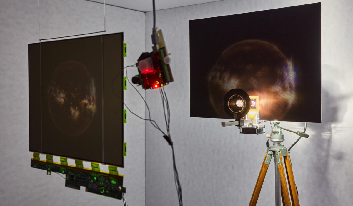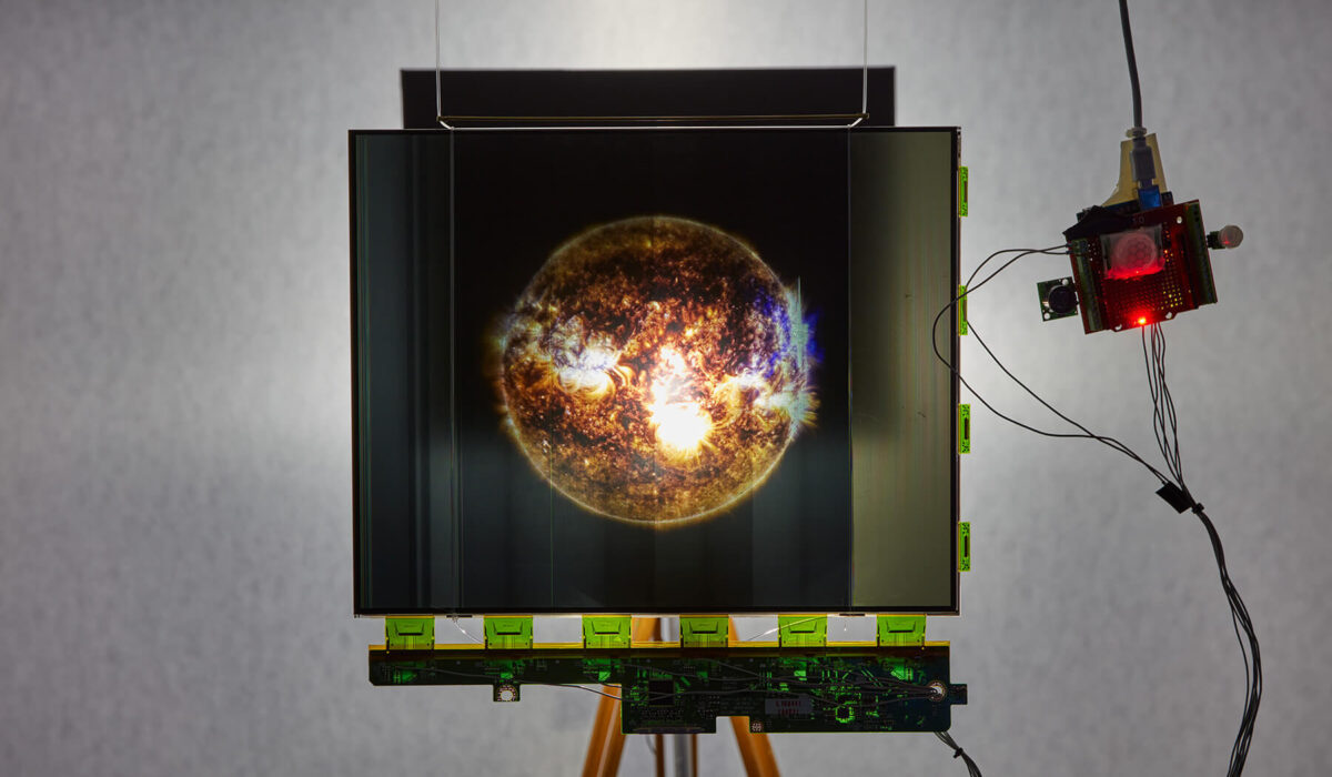 The installation is an experiment in the interaction between analogue and digital images, in which an analogue projection of the Sun appears on a liquid crystal monitor panel that displays a constantly changing pattern. Approaching the LCD panel will result in an error signal in the form of dark, vibrating streaks. The pattern becomes increasingly dense to the point that the image of the Sun becomes entirely blotted out by blackness, creating a virtual solar eclipse.