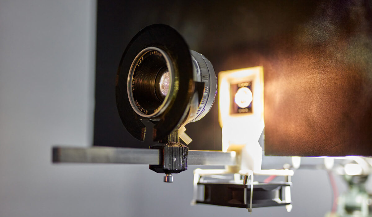 The image that forms on the surface of the work is a fusion of two different media that merge into a single layer. The analogue depth of the slide film meets the countable resolution of the digital matrix grid. The LCD panel is not controlled by the usual interface, but rather, by bypassing it and directly activating the circuits controlling the liquid crystals. This way, what we see is not a preconfigured image, but the outcome of an experimentation process. These ever-changing patterns are errors with respect to the monitor’s function; however, in this case it is these very error signals that convey the work’s main message.