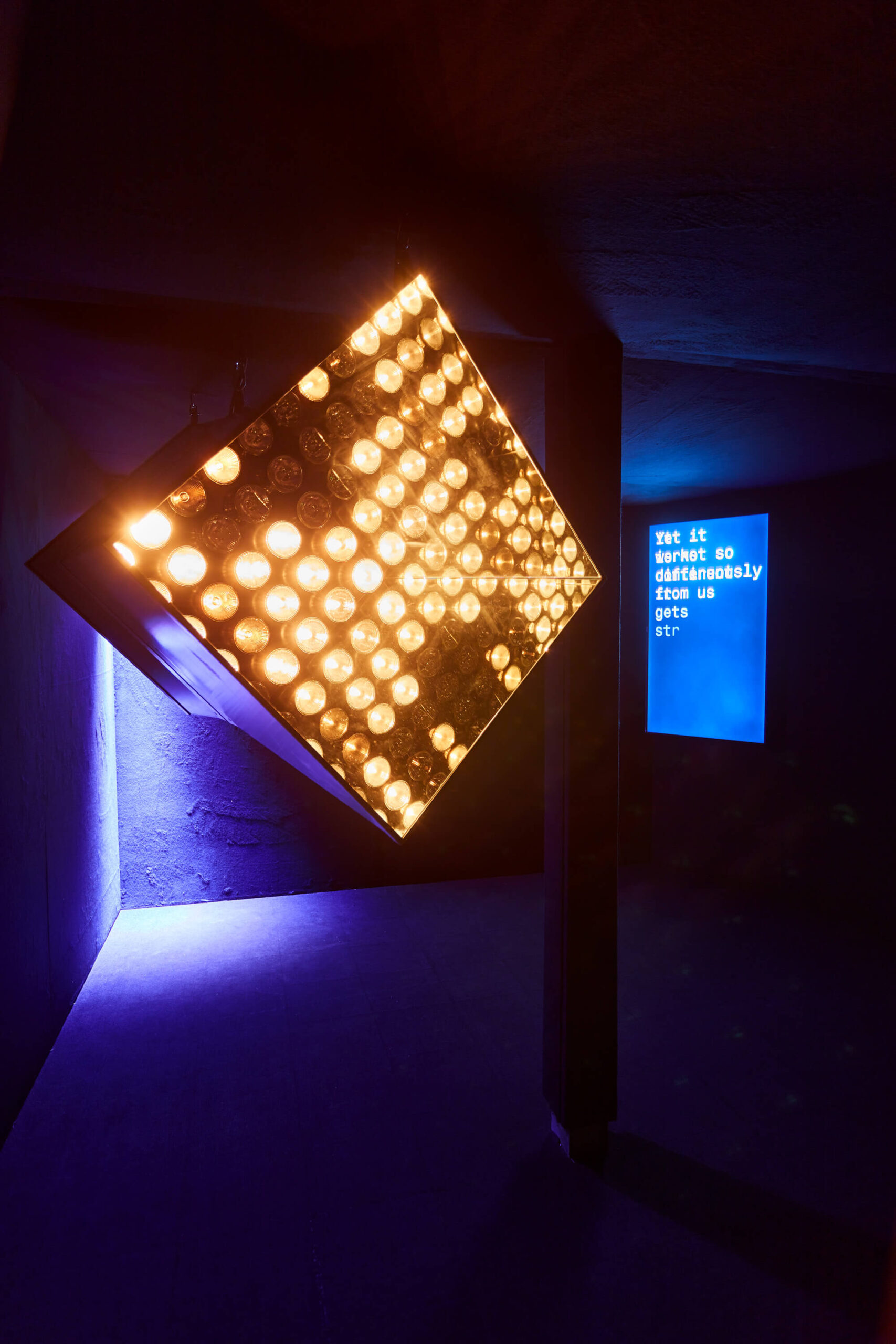 J3RR1 is an ordinary machine in the form of a vast grid of lights flickering, blinking and nearly fading to black, but not quite. The circuit boards and wiring are exposed at the back, setting each other off like a nonstop synaptic crackle. It could be regarded as a model of the human nervous system but in fact the machine is in a constant state of stress-testing, monitoring itself quite pointlessly without knowing what its task really is. Just like during a medical examination, the basic vital parameters (CPU, RAM, disk) of J3RR1 are constantly monitored and connected to a device that translates them into sound and light impulses. Machines are customarily thought of as cold and algid but when standing before J3RR1 we can feel the heat and energy of the halogen lamps that warm them up and hear the sound generated by the 25 solenoids that hit the aluminium sheets the machine is composed of, highlighting the clarity of a command that cannot be ignored.