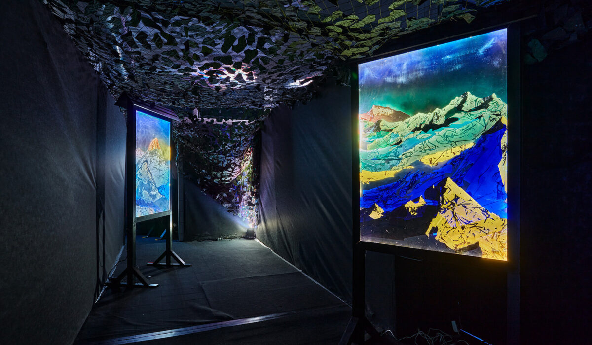 Nature is both an eternal and ever changing milieu, driven by changes in the processes of living and inanimate things. A timeless medium, a network of divergent and intersecting paths on which man leaves his mark. Paths that show their different facets in the contrast of darkness and light. Varying landscapes and formations that invite you to explore. Emergency Exit is a site-specific installation environment of lightboxes that invites you to experience visualisation and unveiling through optical illusion. The ordinariness of the materials used dislodges the pleasant sense of reverie evoked by classically beautiful landscapes, as the natural forms enclosed behind the plexiglass are in fact the result of the crumpling of a plastic film or adhesive tape.