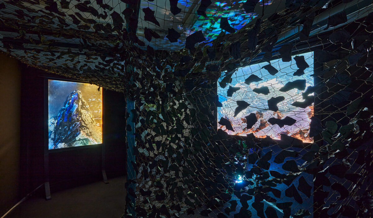 Site-specific installation, lightboxes, wood frames, camouflage net