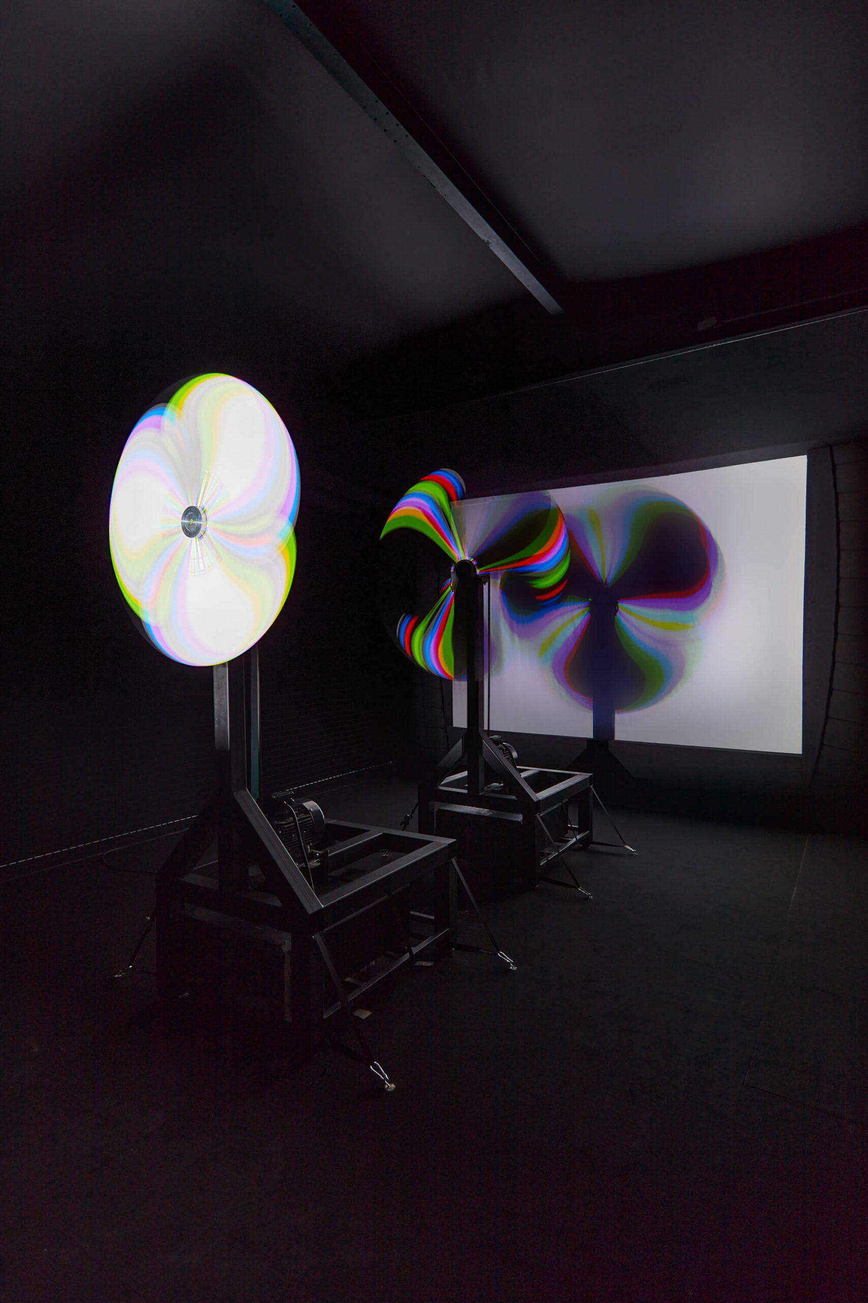 Whether Weather mechanically breaks up a homogenous beam of white light and scatters it into a myriad of colourful pieces. The interference created by the different speeds of the huge propellers is organised into a pure composition, with sounds of varying intensity with the different phases of split-up white light alternating. When the high-precision machine brings the propellers into synch, their joint silhouette on the white screen also transforms. The turbulence generated by the harsh, dominating colours, the whizzing sounds and the rapid rotation is playful and aggressive, attractive and devastating, simultaneously bringing us closer to understanding the nature of light and challenging our notions of the physical properties of reality.