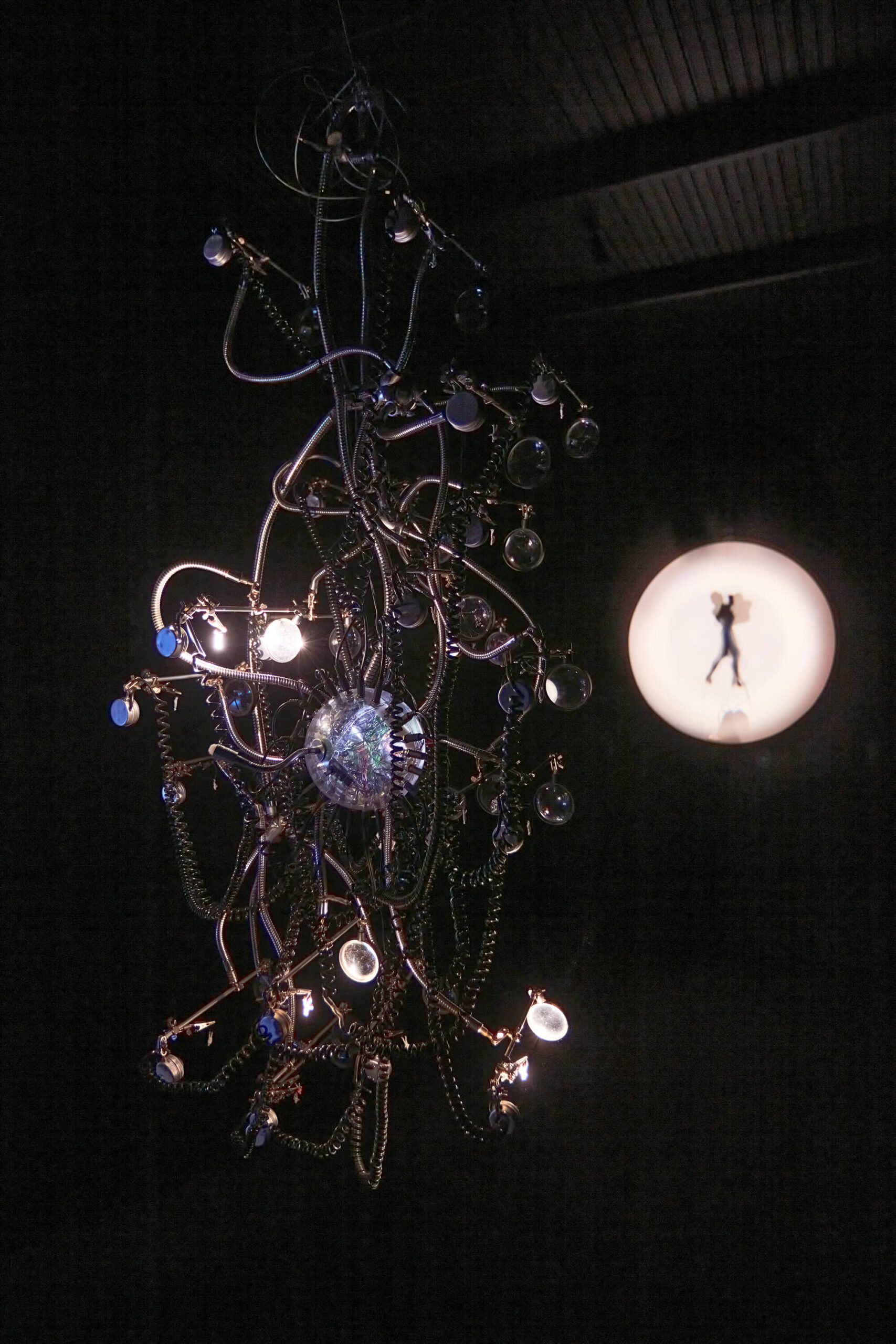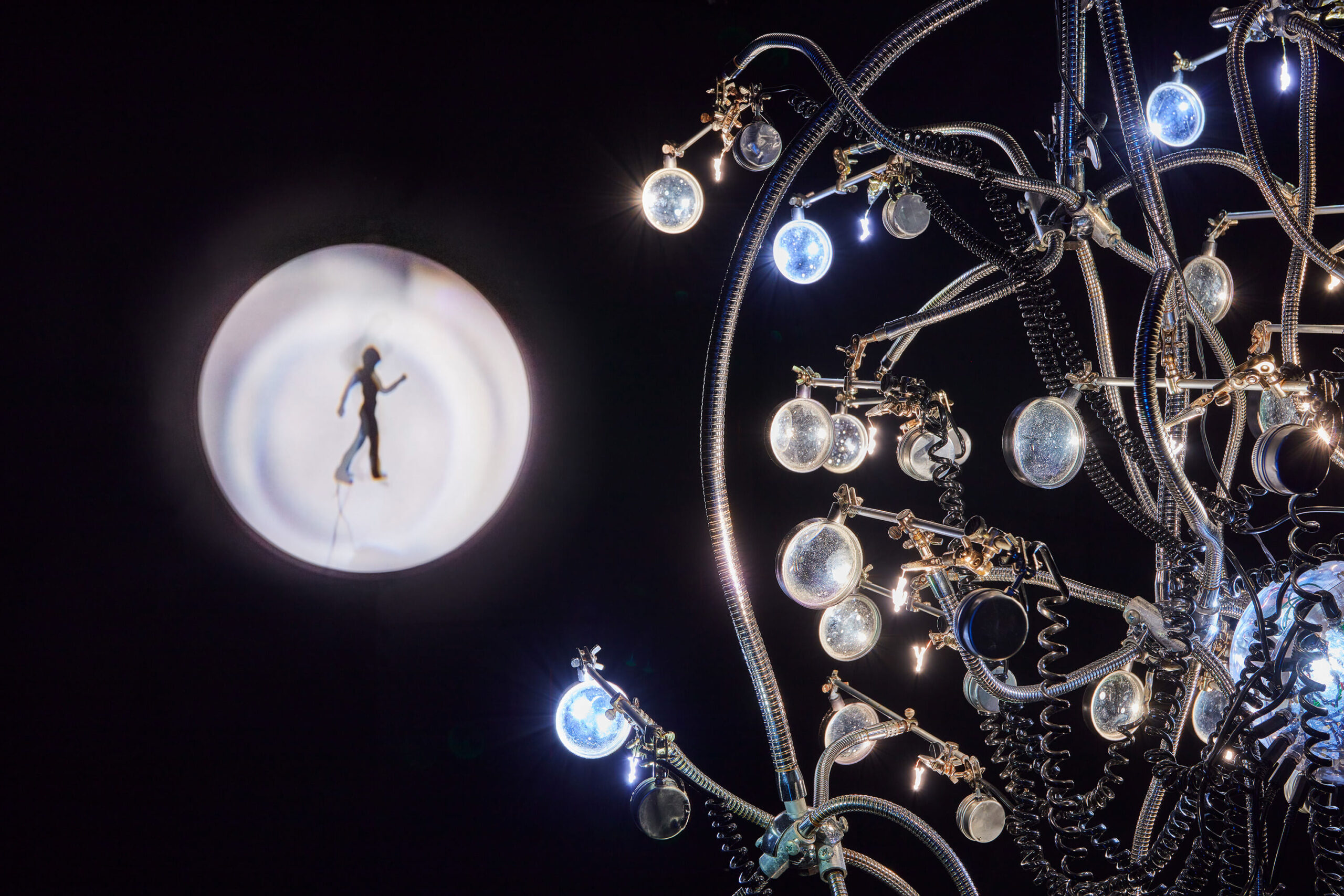 The 24 LED projectors mounted on the installation are controlled by a special circuit. The lights flashing every second illuminate the objects in front of them and the resulting 24 unique images create a film-like sequence as a result of the afterimage effect.