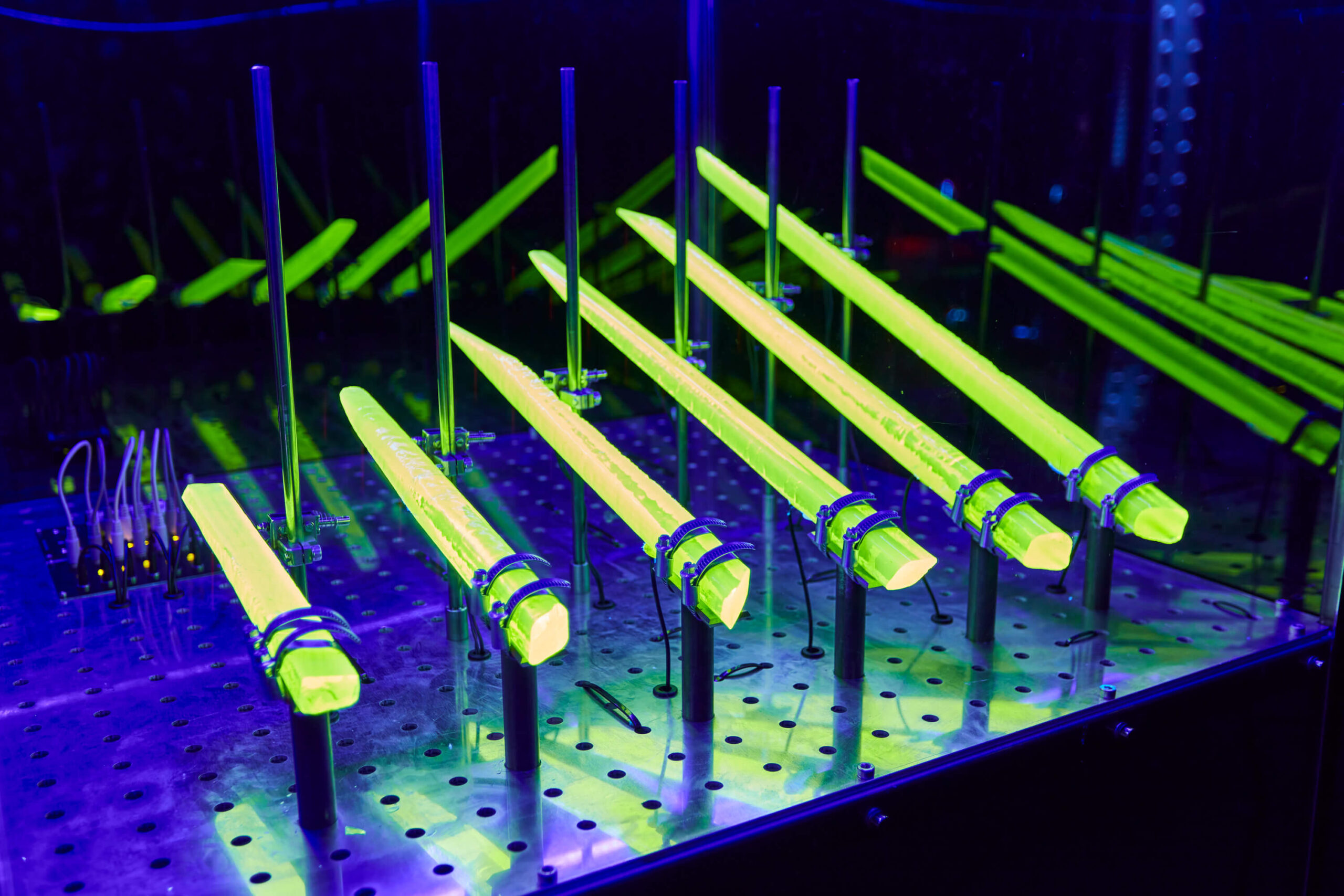 The music formation and art group Sárgany – which borrowed its name from the archaic Hungarian word for uranium – created its latest work specifically for this exhibition with its central element being a speculative object made of uranium glass: a tuning fork used for a fictitious initiation ritual to expose the participants to concentrated radiation*. The glass object is put in motion by the knocking sound of solenoid motors controlled by a uranium-ore-driven eurorack module. Using a Geiger–Müller counter, this module measures the intensity of radiation released by the decomposition of uranium ore and transforms the measurements into random signals. The thus generated vibrations of the glass object are picked up by a microphone and transferred into a sound-box, made using a resonator inside the vitrine. The uranium-oxide in the uranium glass lends the object a strong fluorescence under UV light. Radioactivity, which is unperceived by our senses, is represented sonically by the sound vibrations and visually by the fluorescence.