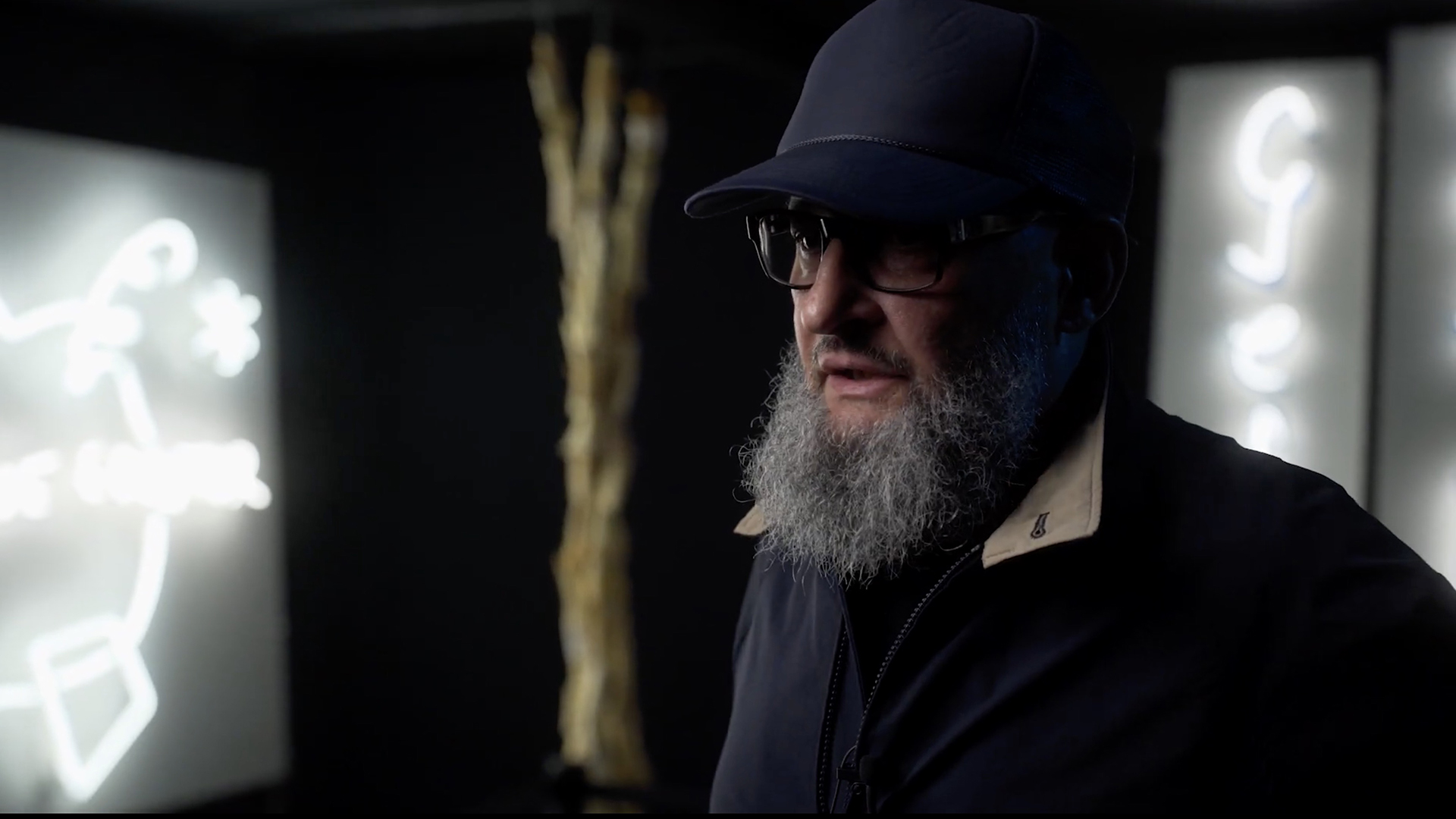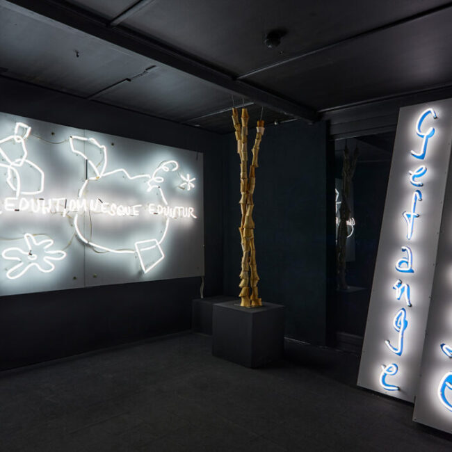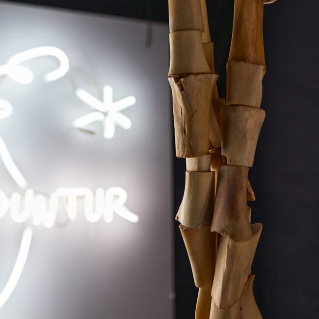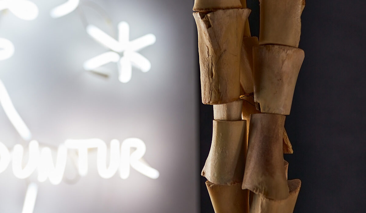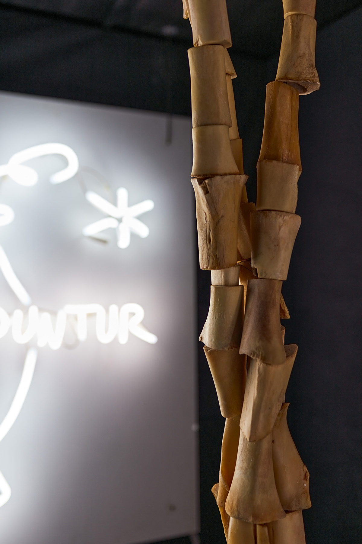 Neon, wood/ carved bone, metal structure / neon installation, fibreboard