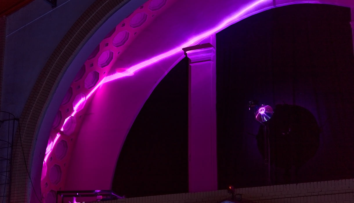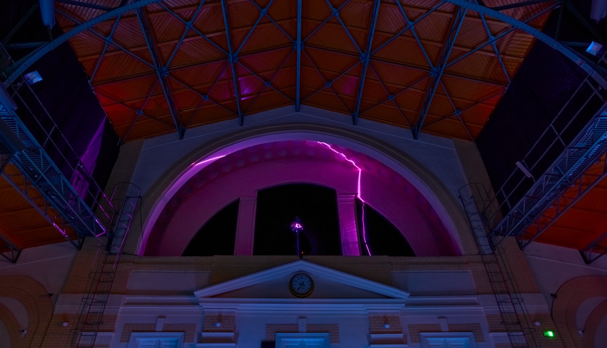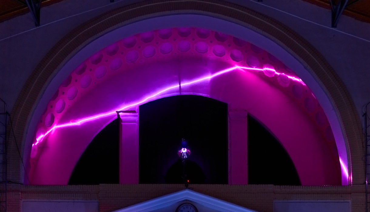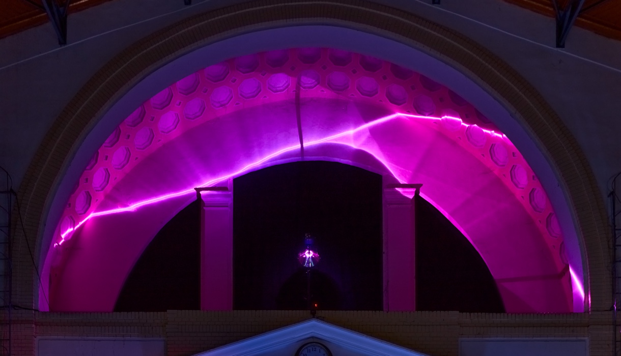 The light simultaneously scans the surface of the arch and cuts out details of space from the vast space. The meeting of the robust structure’s movement adapted to the given space and the precise laser with the elusive smoke enveloping the space creates a situation that appears precise and random at the same time, and which, balancing between the duality of being seen and hiding creates a constantly morphing new element in space out of immaterial light and smoke.