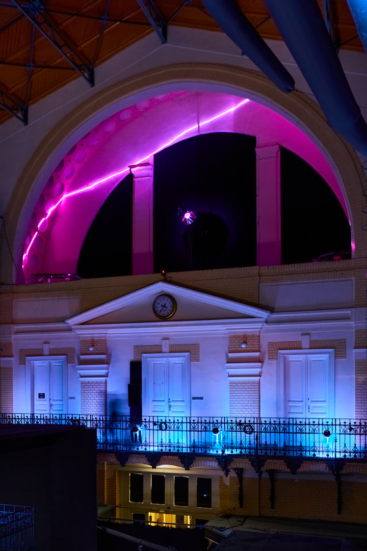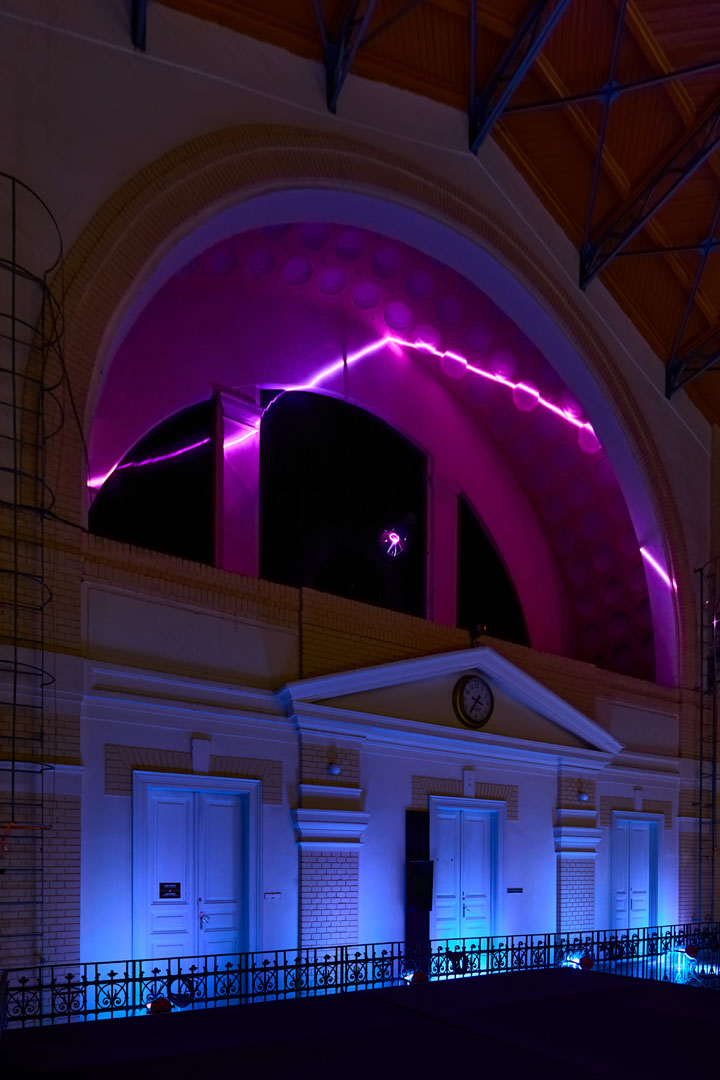 The protagonist of the installation by The Corporation artist duo (János Borsos and Erik Mátrai) is an important yet invisible part of the building you are in: the space under the huge arch, which provides space for the large windows that had to be permanently darkened when the former market hall was converted into a museum. In the middle of this space, which lost its original function but still occupies a prominent position, the artists installed a structure fitted with a special cone, which transforms the point-like laser light that illuminates it into a light-plane, scanning the space around it.