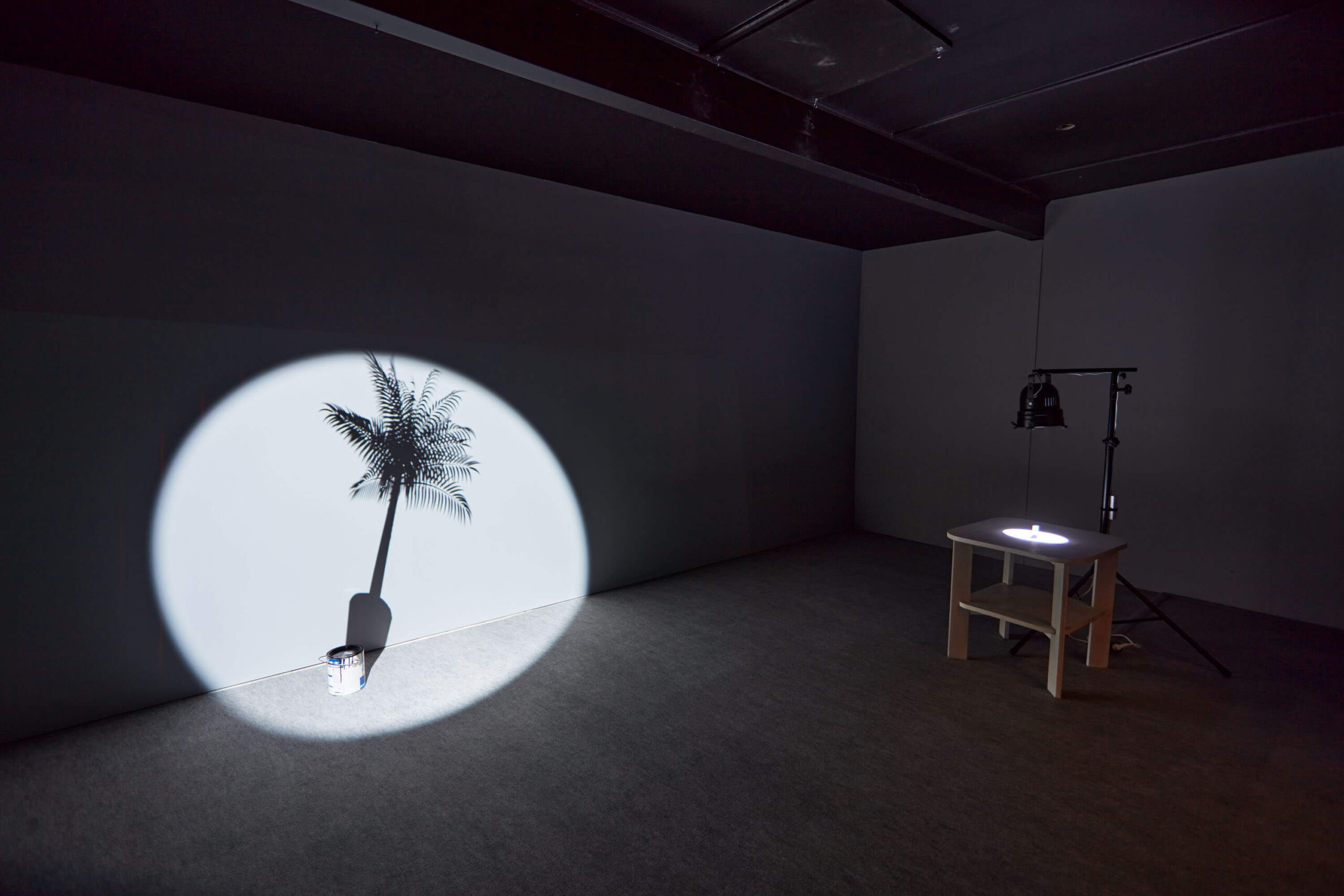 In one of the projections the shadow of a palm tree bending in the wind appears to be rising from the paint box on the floor of the exhibition space, creating an absurd illusion, while in another miniature installation the shadow of an eraser, viewed from an imaginary perspective, becomes a monumental tower with a flag on top.