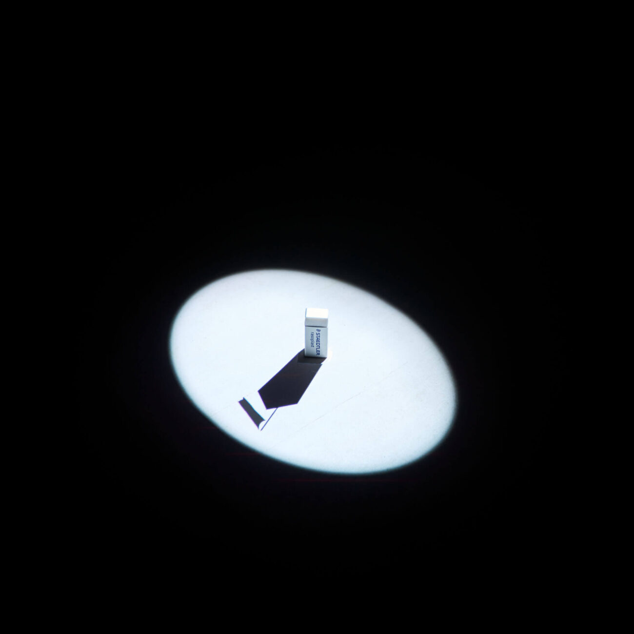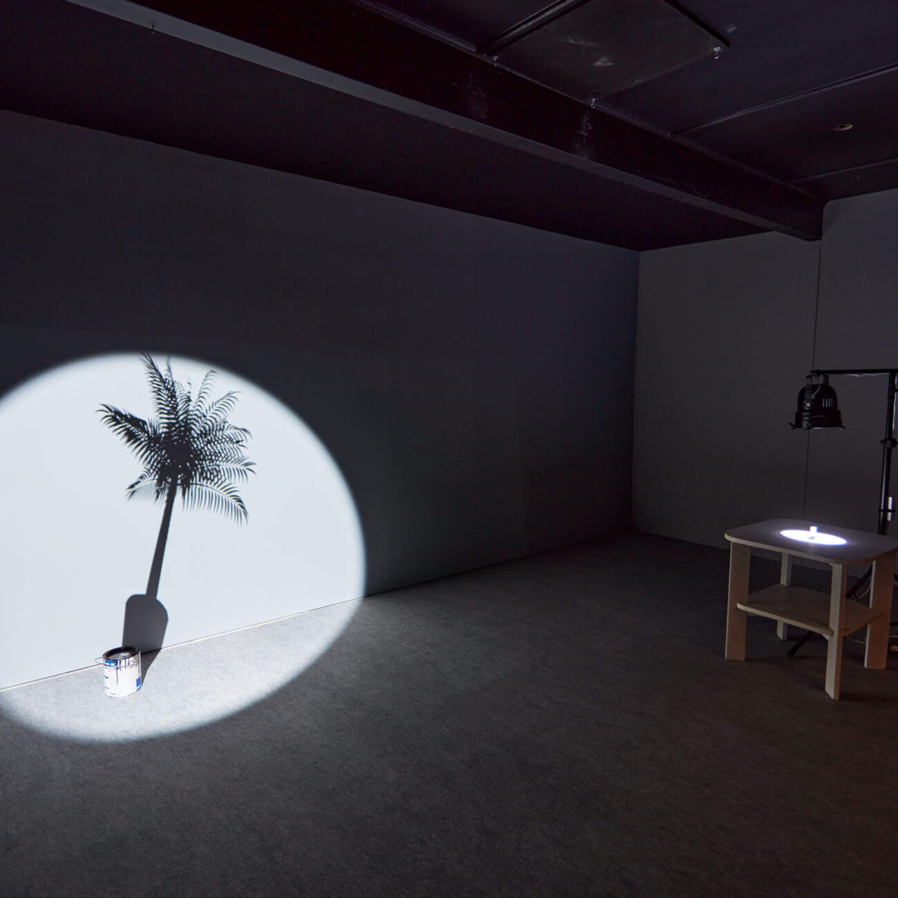 In one of the projections the shadow of a palm tree bending in the wind appears to be rising from the paint box on the floor of the exhibition space, creating an absurd illusion, while in another miniature installation the shadow of an eraser, viewed from an imaginary perspective, becomes a monumental tower with a flag on top.