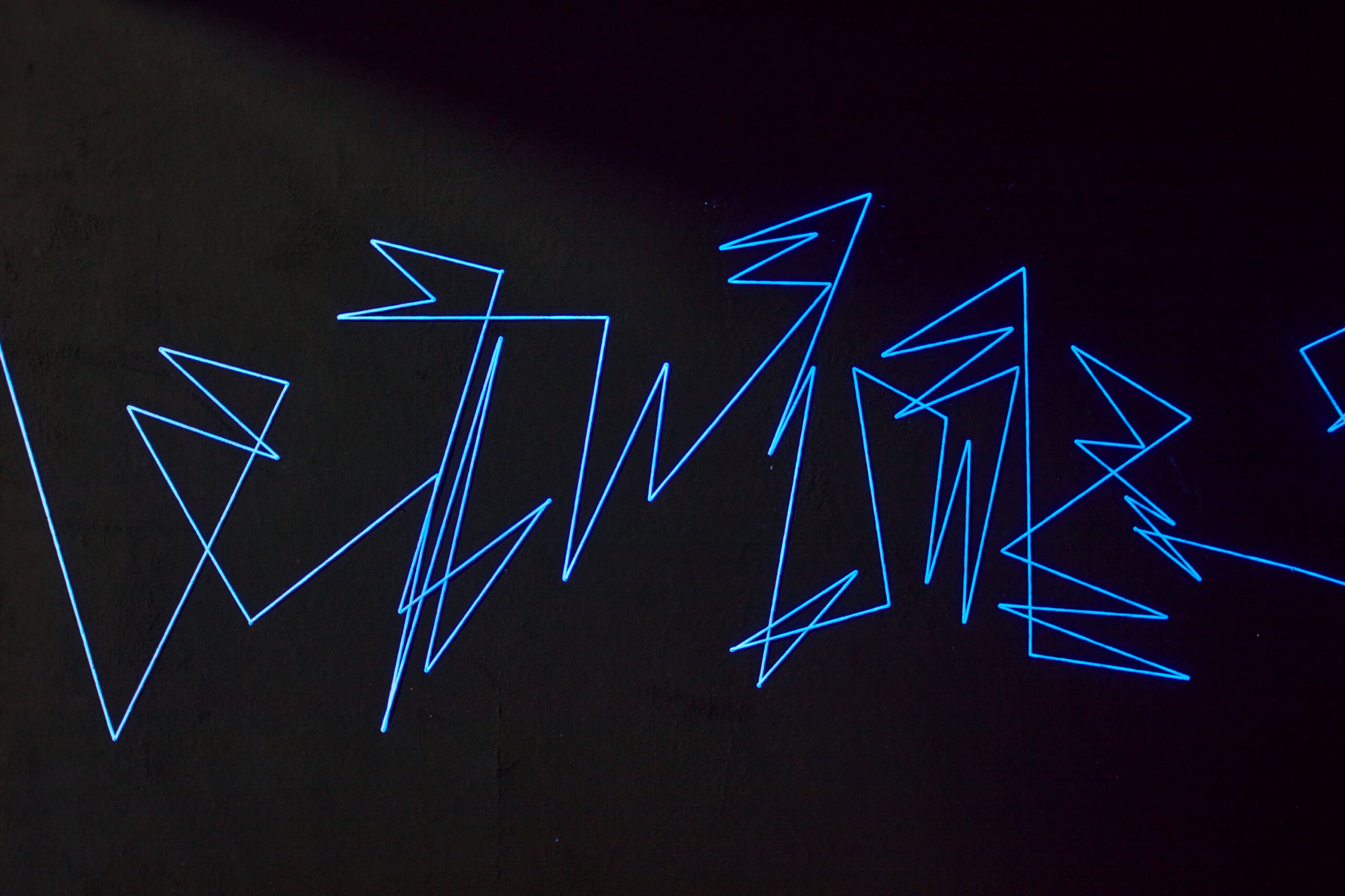 OTTWW is an uninterrupted, complex and continuous line running across the walls of the room in the form of a UV-sensitive thread stretched by nails. Inspired by the classic poem Ode to the West Wind by 19th-century English poet Percy Bysshe Shelley, the conceptual work builds on the artist’s earlier graphic variations around the letter W.
