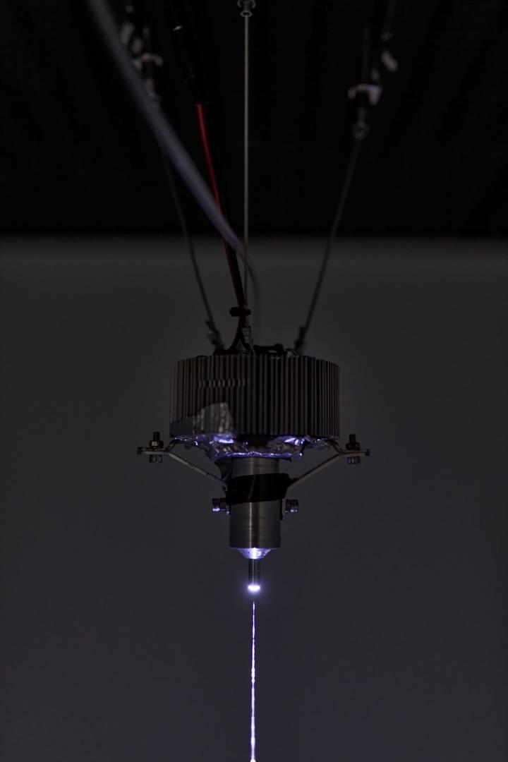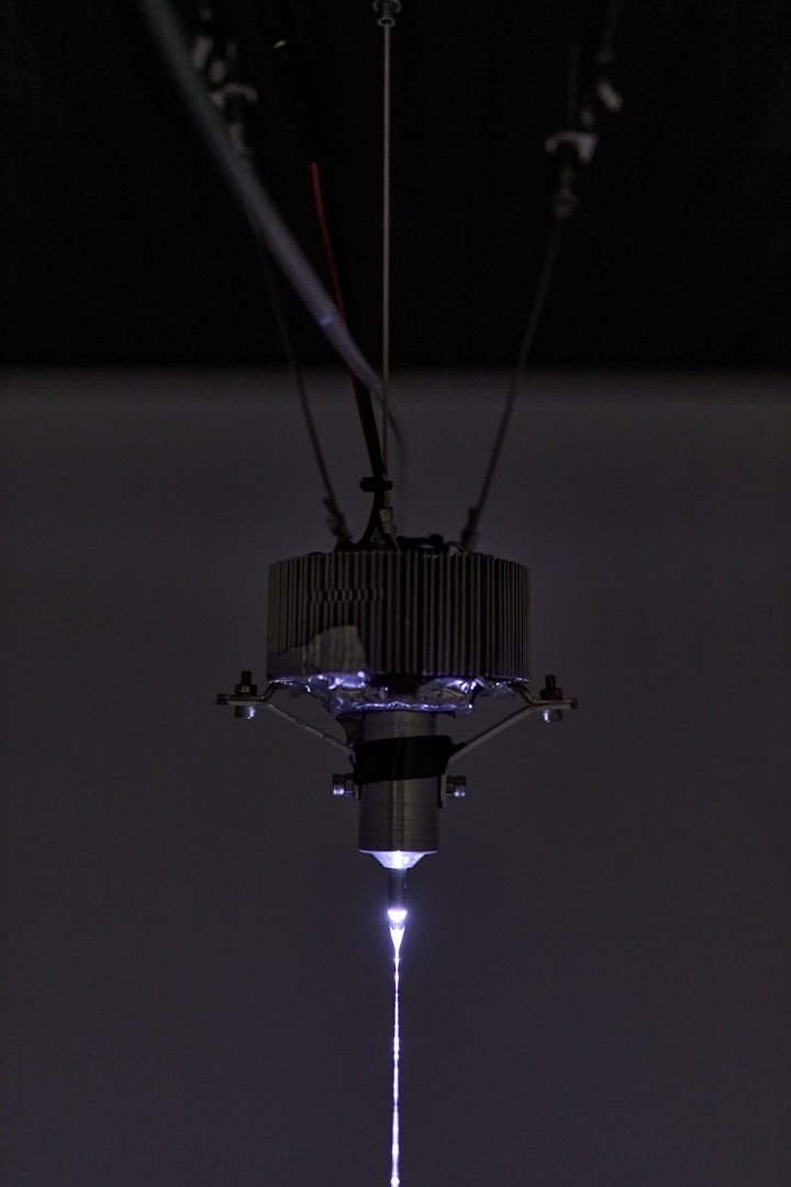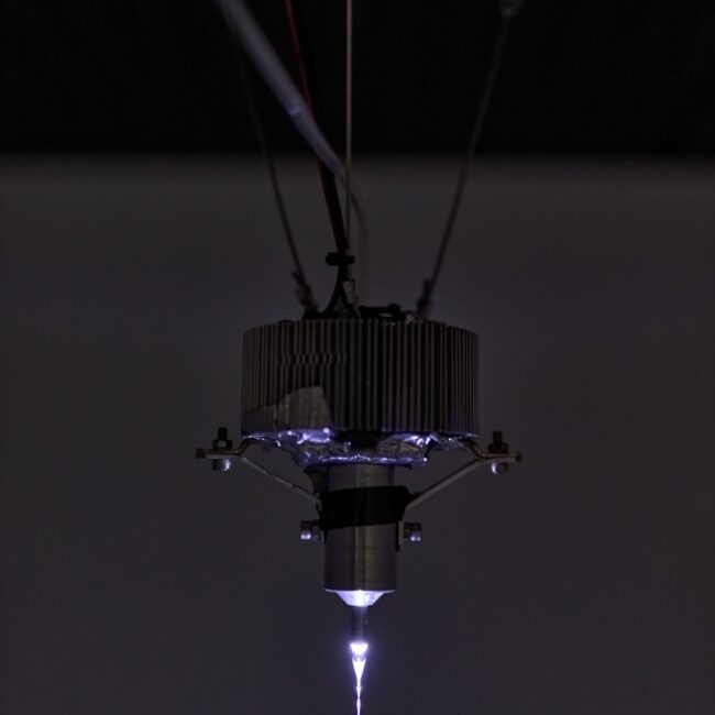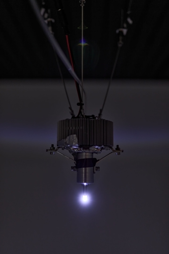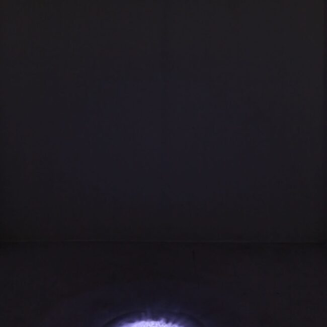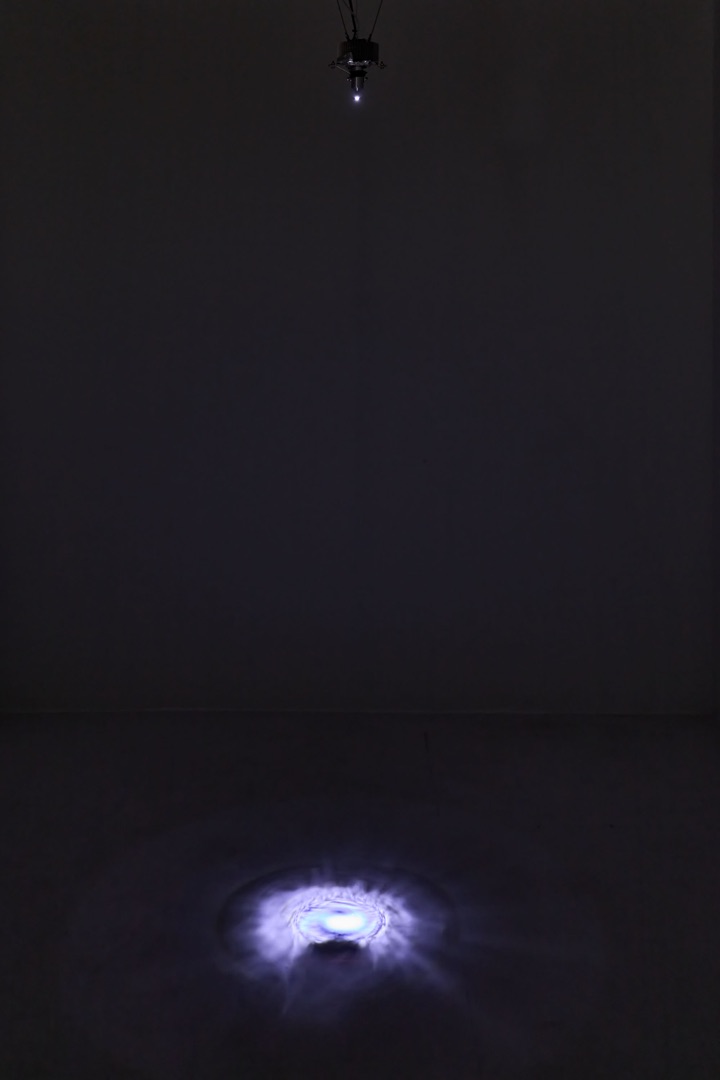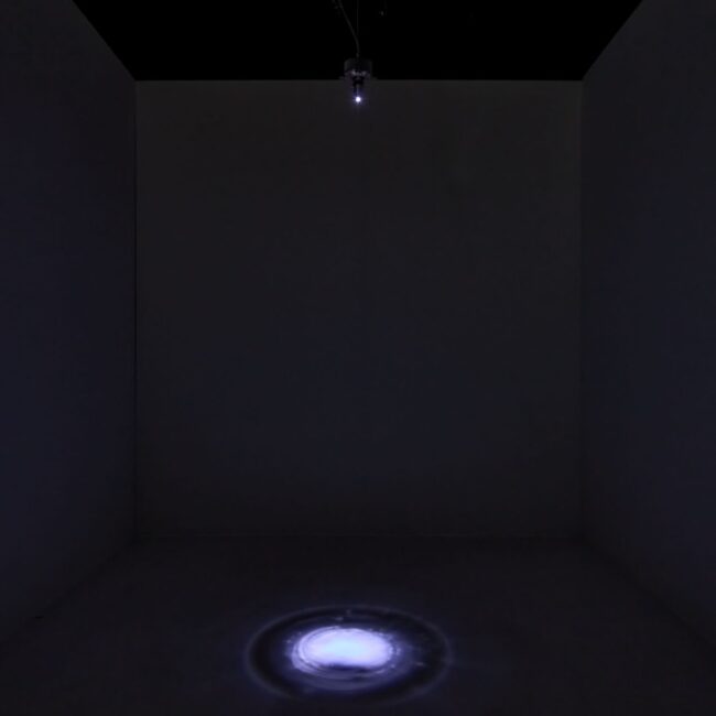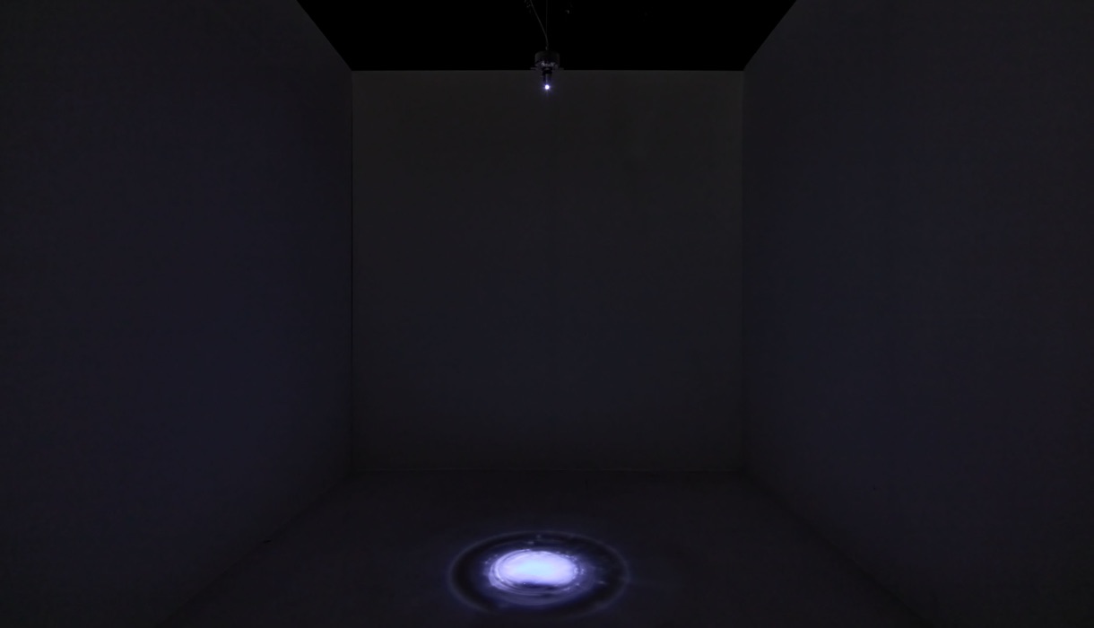 In his poetic and minimalist installation, Chida places emphasis on the darkness between bright moments. A water droplet on the ceiling of the exhibition space slowly swells and upon reaching 0.04 millilitre, the surface tension of the water can no longer resist the force of gravity and the water droplet suddenly drips. The falling droplet passes through a point of light, and at the moment the two meet, the water droplet functions as a lens and a prism, scattering the light in the space.