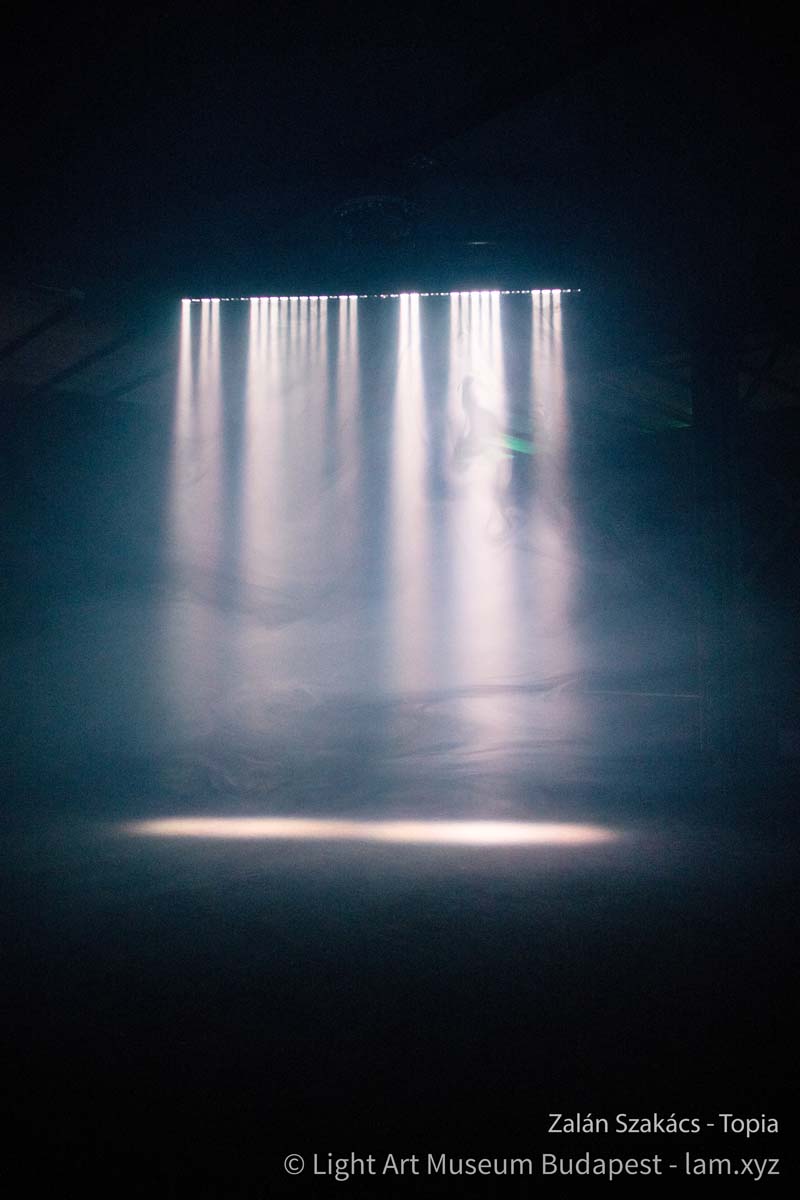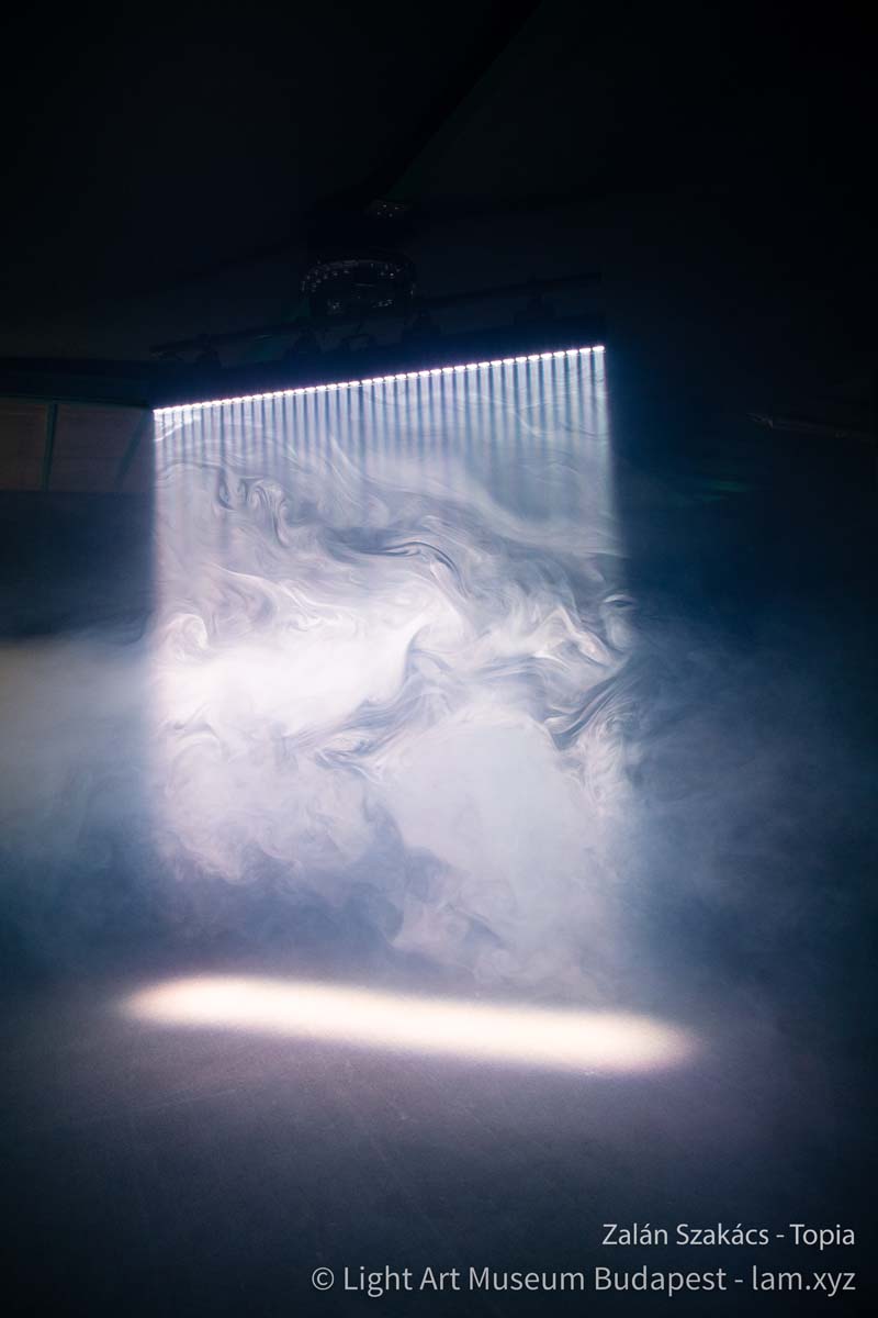 Topia is a luminokinetic installation that evokes the Renaissance architect Leon Battista Alberti’s intellectual tradition of a point-of-view perspective on reality, interpreted as a window opening onto reality. The work seeks to present the two-dimensional world that emerges from the virtual windows of the digital screens we all use today, which can be interpreted as post-kinematic projection screens, in a stage-like space, using sculptural devices to create a plastic dimension. Taking into account the changes in the etymology of the concept of the screen over time, Szakács’ work draws on the historical context of the screen, which originally had an architectural function, when, referring to the original function of the image display device, it invites the viewer to enter a “screen space” in which the visible but not tangible surface appears as an invisible wall projected onto a fog rolling in space. This new screen is in fact an immaterial interface, created through digital technologies but manifested in a physical environment. The curtain-like nature of the wall of light emphasizes the flatness of the “screen,” while the light blue colour evokes the typical colour range of LED screens that are ubiquitous today.
